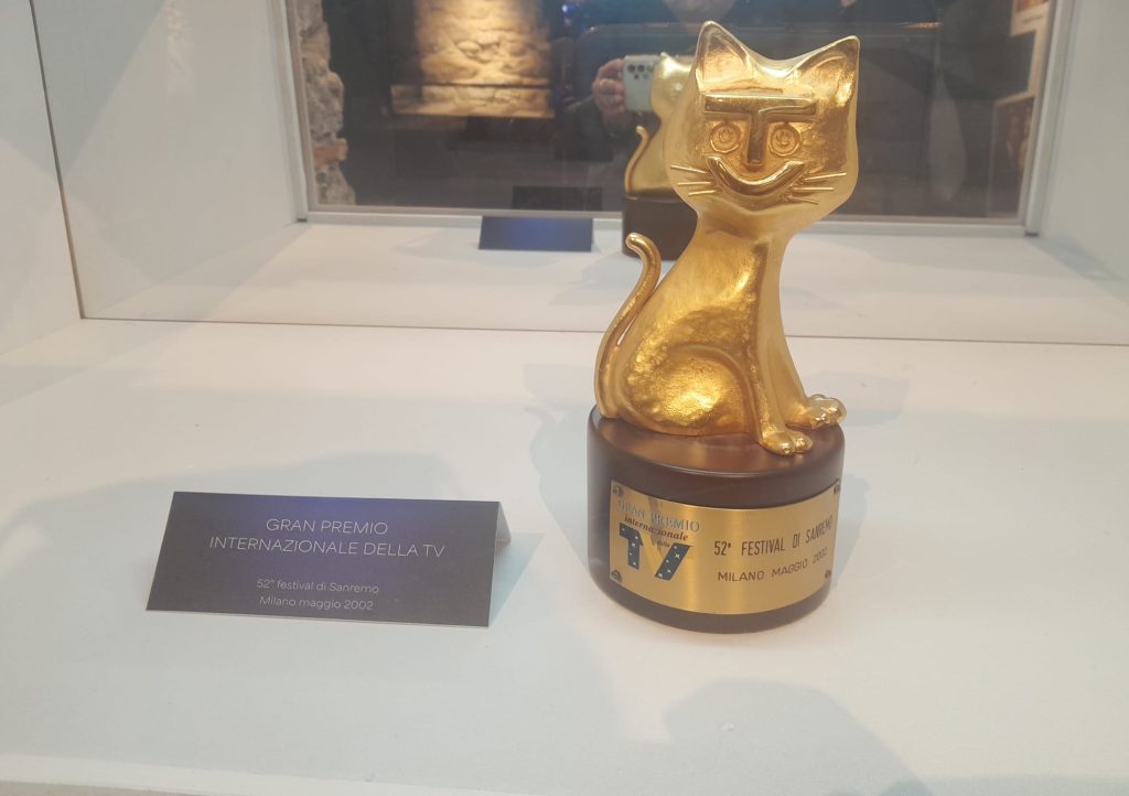 Stop: riavvolgiamo il nastro. Ci stupiamo del clamore mediatico del Festival odierno? Ma che atmosfera deve essere stata quella di un Sanremo dove un cantautore in gara si suicidò? Le radici di questo pachidermico essere televisivo italiano non a caso detto kermesse, dal sapore liturgico e insieme di sagra paesana, passano per stratificazioni di linguaggio televisivo e costume italiano. Inestricabili. Tant’è che in mostra si fa cenno anche a un curioso fatto linguistico che sancisce la presenza di Sanremo nella lingua italiana, ovvero la codificazione di termini come “baudismo”, “pippobaudismo” ecc, riconosciuti da Treccani ed entrati nel gergo di chi fa e segue la televisione in Italia. Vedo telegatti, vedo la copia della prova di esame di Baudo alla Siae e scopro che depositò un centinaio di brani. Giorgia, Pausini, Ramazzotti. Ci sono gli smoking usati durante le serate, e c’è anche la possibilità di farsi filmare mentre si annuncia il festival, su green screen. Ovviamente lo faccio, chiudendo la performance con la battuta “l’anno prossimo mi chiamate eh”. Sento di essere boomer più che mai: mi avranno contagiato i signori di prima? I ragazzi addetti a questo giochino mi sorridono con la faccia tirata, probabilmente hanno sentito questa battuta stanca già centinaia di volte e odiano tutti.
