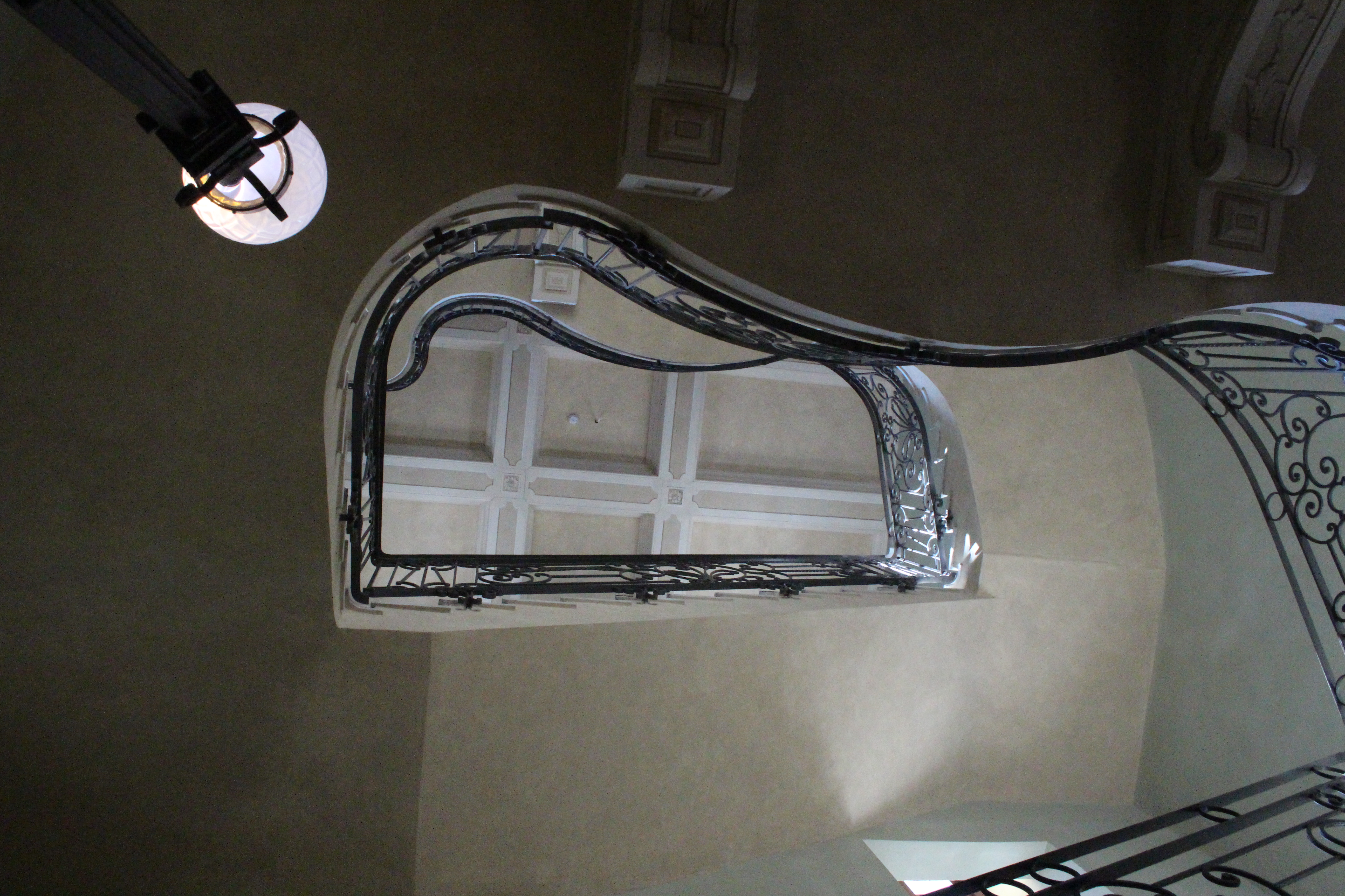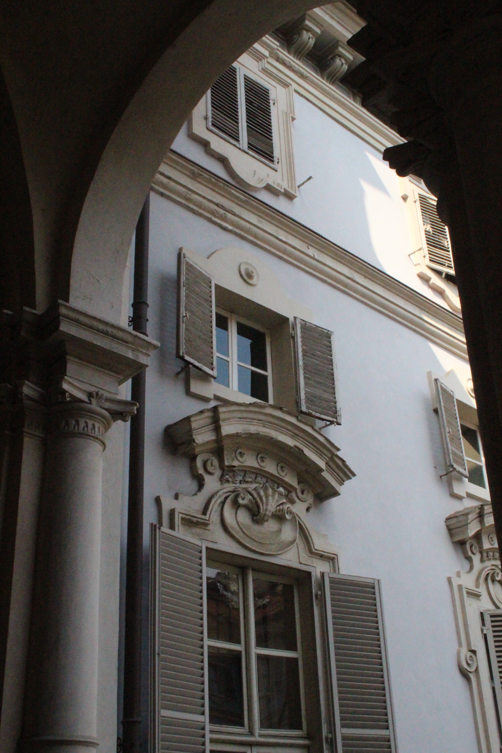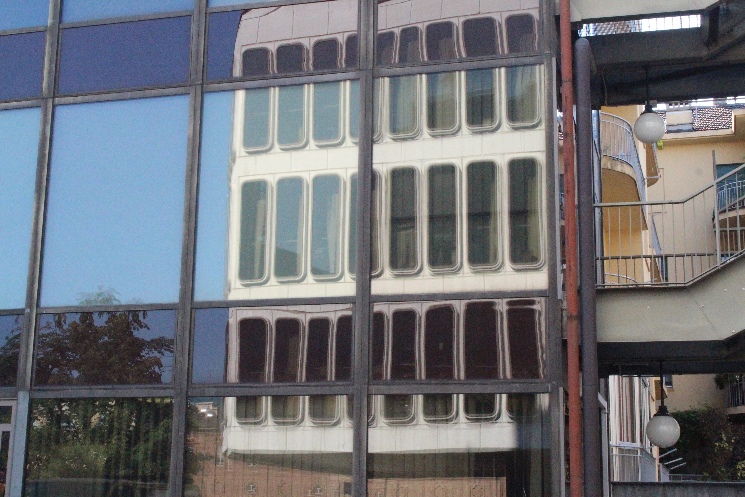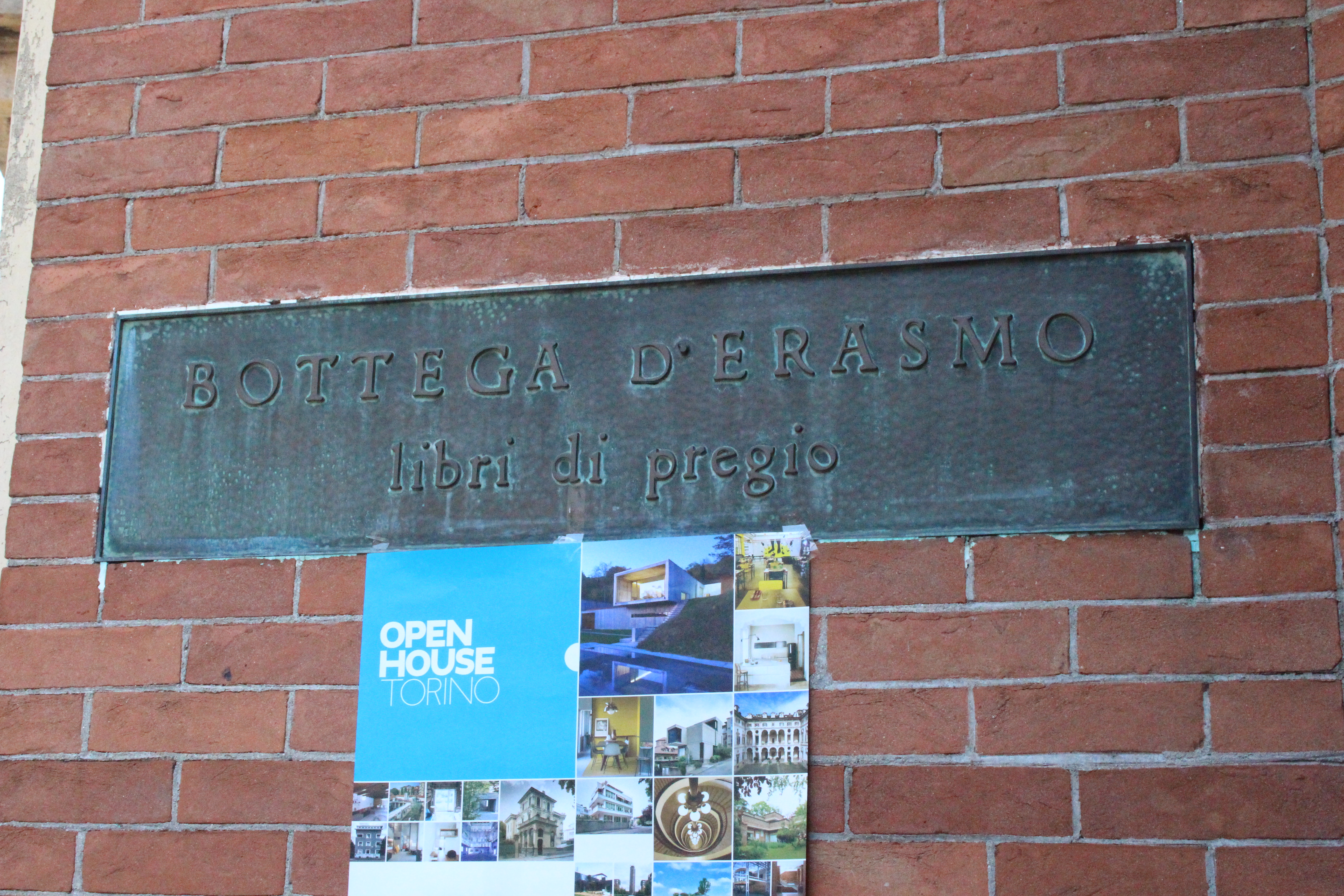 Il mio giro non è finito qui, ho visto infatti ancora Palazzo Bricherasio, ora sede di una banca. Sontuosissimo e un po’ straniante tra stucchi e decori barocchi, lampadari raffinatissimi in vetro di Murano e moderne strutture da ufficio. Ricordo di averci visto anni fa una mostra sul papiro di Artemidoro, ma evidentemente è passato tempo e ho rimosso i ricordi, o più probabilmente l’allestimento non aveva dato spazio al palazzo ma al contenuto della mostra. Ero già stata anche alla Bottega di Erasmo, in via Gaudenzio Ferrari, in quel particolare palazzo con la facciata geometricamente insolita che ospita la biblioteca del dipartimento di psicologia. Era una bottega di tipografia, e poi una libreria, e qualche segno ancora resta, così come dettagli di costruzioni e infissi che sembrano quelli di uno spot anni ’50.