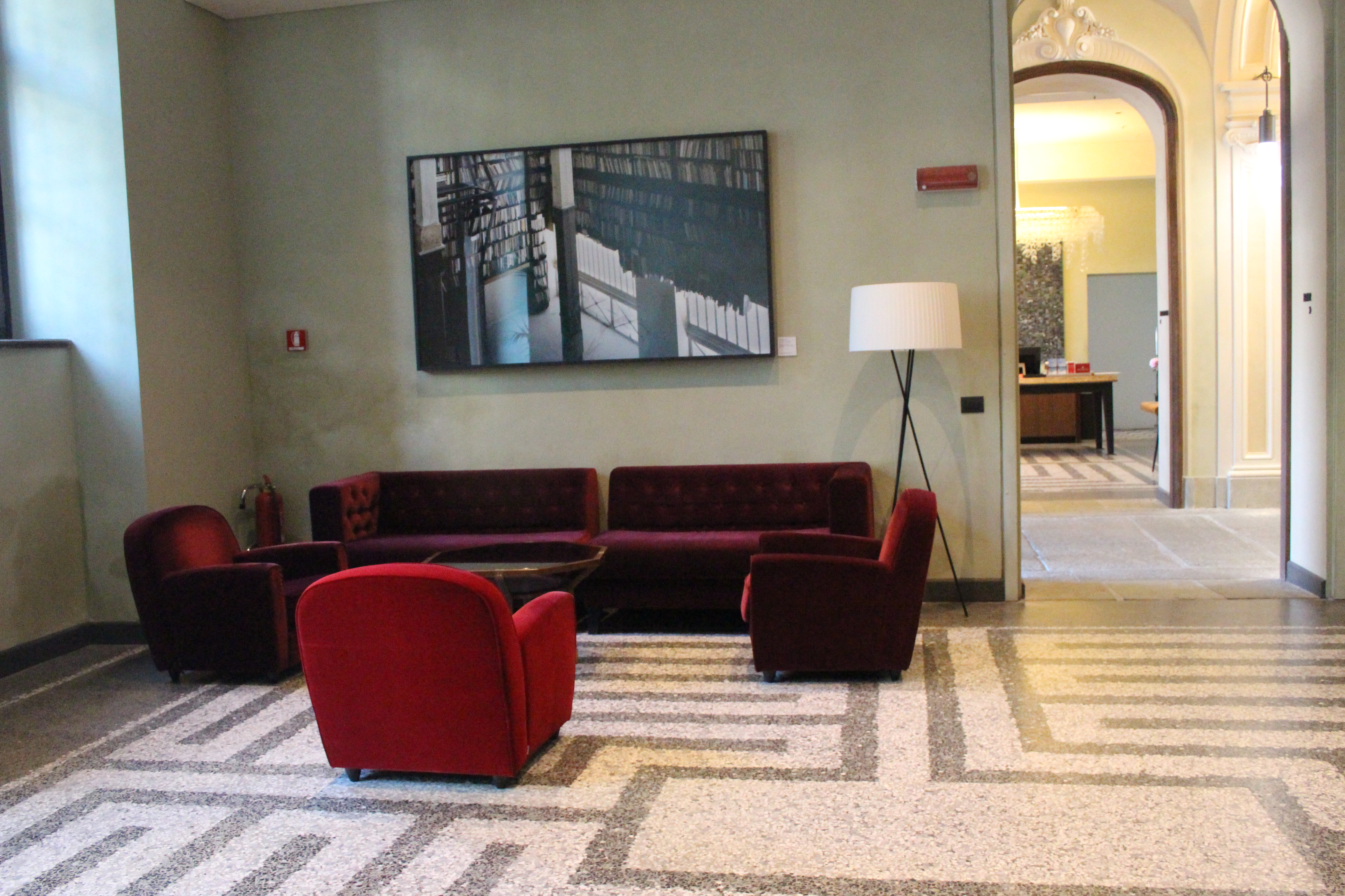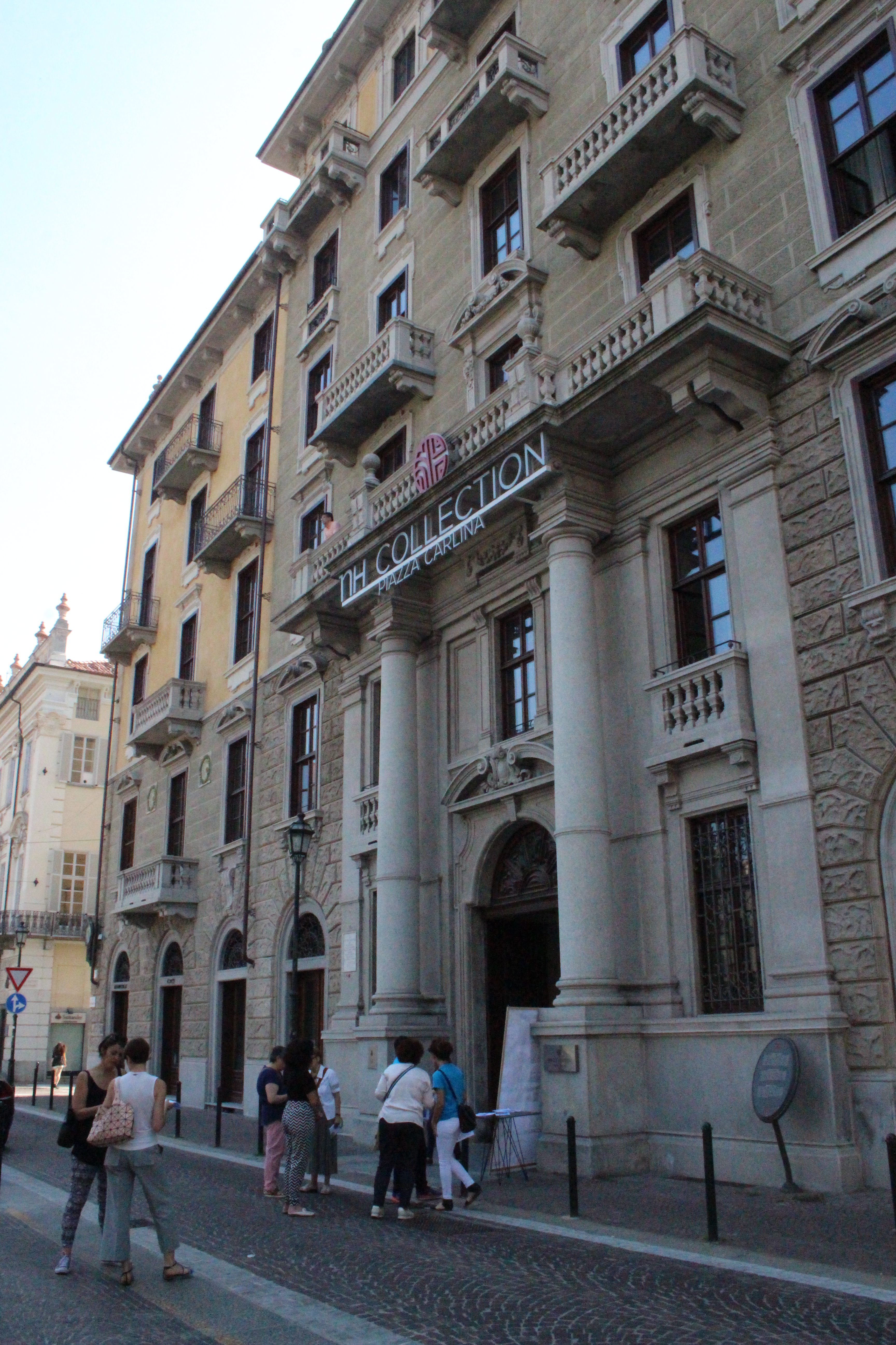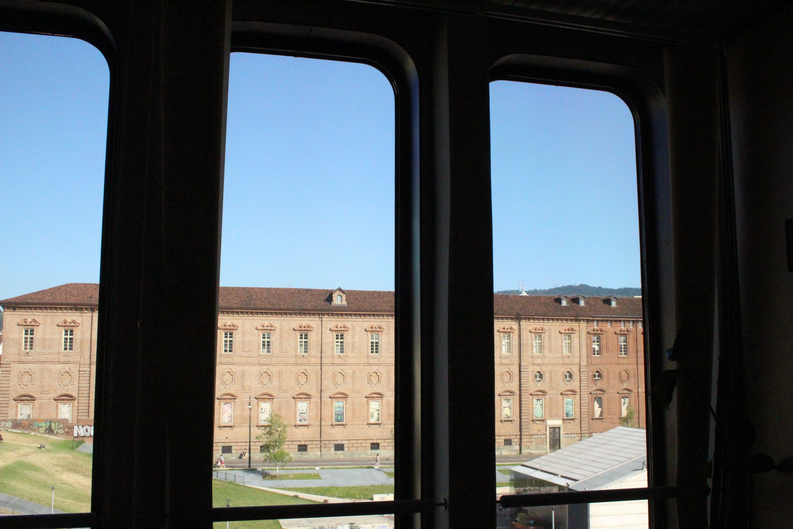 Quarantacinque minuti di coda sono stati necessari per entrare a Palazzo della Luce, da che ho capito dalla spiegazione, ex palazzo della radio prima dell’EIAR (e poi RAI) e poi palazzo dell’ENEL, da cui il nome che fa riferimento alla luce. Pare la gente venisse qui, in questo sontuosissimo ed enorme palazzo con scale e saloni monumentali, a pagare le bollette. I ricconi, invece, soggiornano a Torino all’hotel NH di Piazza Carlina, recentemente restaurato nel palazzo sui cui una lapide ricorda il passaggio di Antonio Gramsci. Che dire: un palazzo secentesco ri-ideato in chiave moderna e funzionale a un hotel, con stanze che sono un sogno, un cortile intero in ciottolato originale in cui fare colazione, un bar di classe che occhieggia agli anni ’20 e una terrazza panoramica con cespugli di fragole direttamente da cogliere sul posto e vista Mole. Anche qui ci sono dettagli preziosi e di classe, come la scala o la piastrellatura. Nel cuore mi è rimasta una stanza, in cui il letto si affaccia direttamente sulla finestra che a sua volta si apre sulla piazza. Un sogno, ve lo garantisco.
