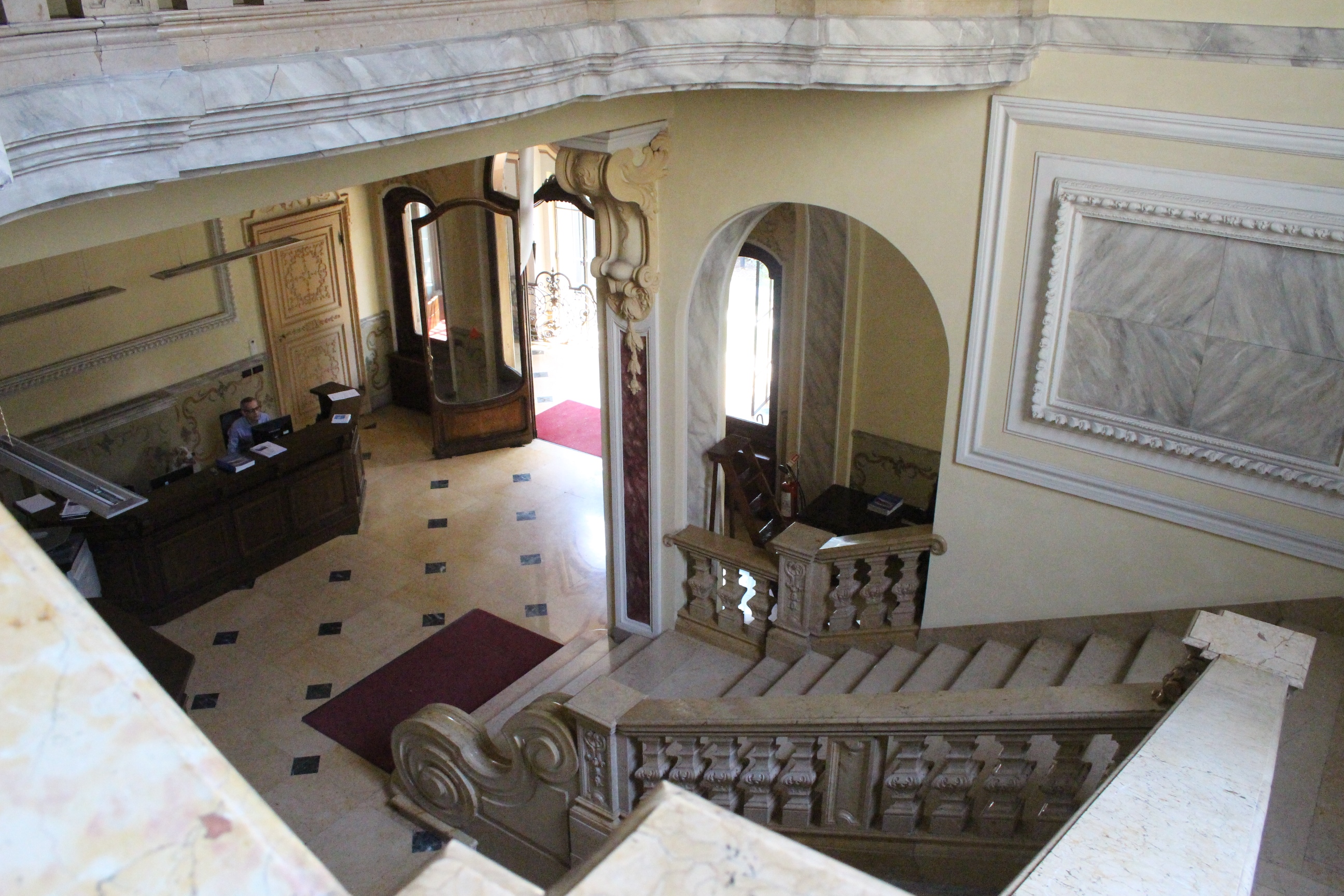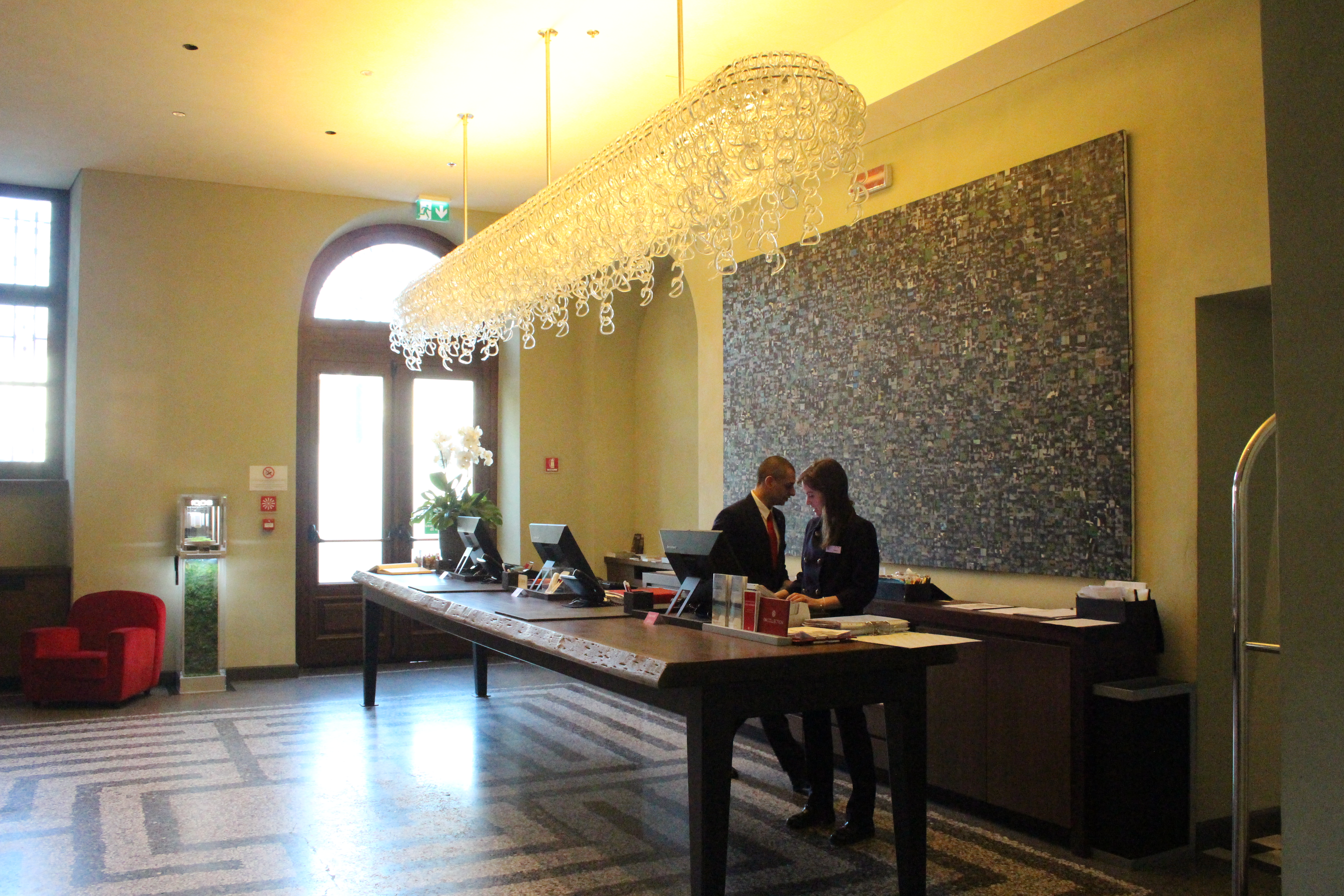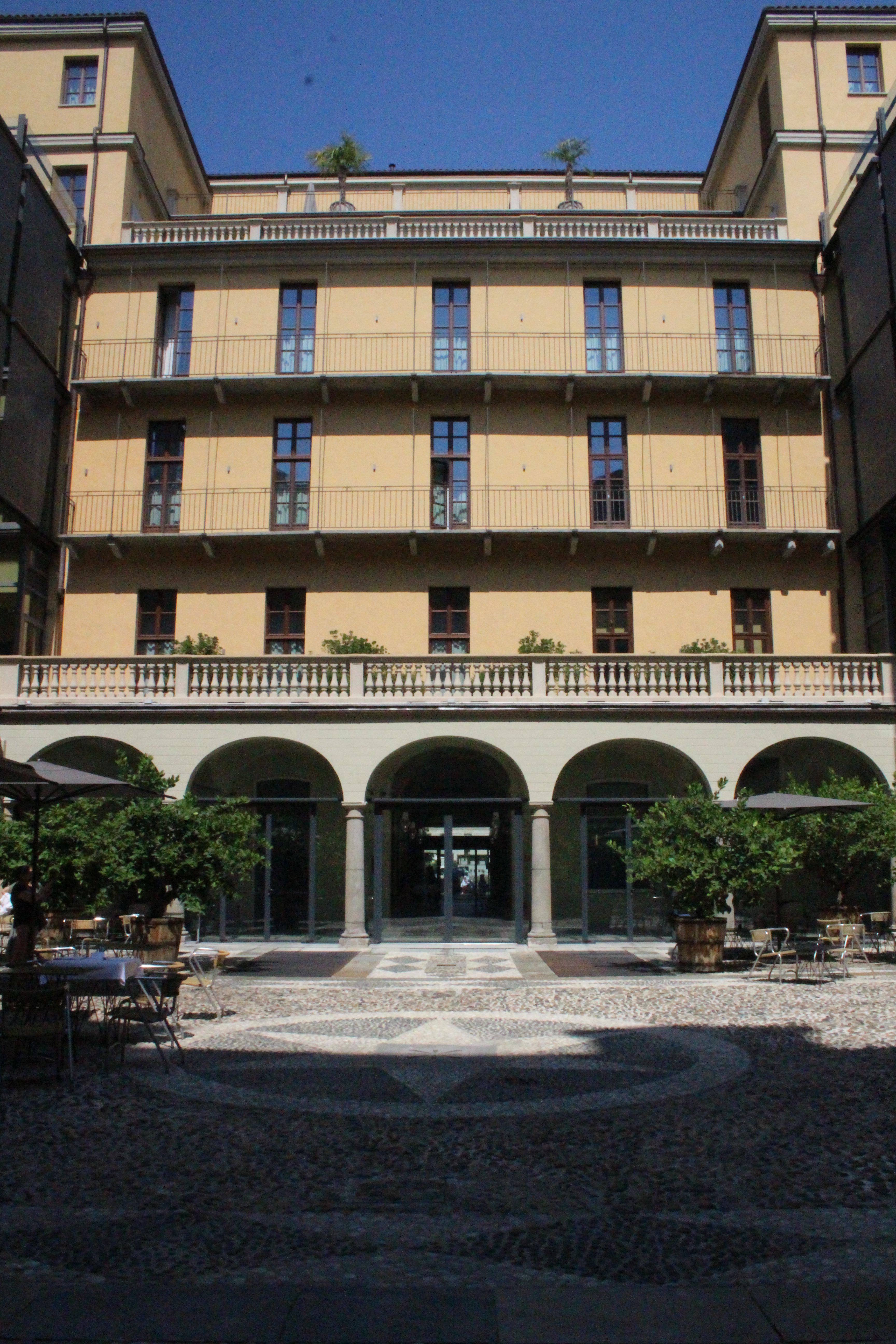 Quarantacinque minuti di coda sono stati necessari per entrare a Palazzo della Luce, da che ho capito dalla spiegazione, ex palazzo della radio prima dell’EIAR (e poi RAI) e poi palazzo dell’ENEL, da cui il nome che fa riferimento alla luce. Pare la gente venisse qui, in questo sontuosissimo ed enorme palazzo con scale e saloni monumentali, a pagare le bollette. I ricconi, invece, soggiornano a Torino all’hotel NH di Piazza Carlina, recentemente restaurato nel palazzo sui cui una lapide ricorda il passaggio di Antonio Gramsci. Che dire: un palazzo secentesco ri-ideato in chiave moderna e funzionale a un hotel, con stanze che sono un sogno, un cortile intero in ciottolato originale in cui fare colazione, un bar di classe che occhieggia agli anni ’20 e una terrazza panoramica con cespugli di fragole direttamente da cogliere sul posto e vista Mole. Anche qui ci sono dettagli preziosi e di classe, come la scala o la piastrellatura. Nel cuore mi è rimasta una stanza, in cui il letto si affaccia direttamente sulla finestra che a sua volta si apre sulla piazza. Un sogno, ve lo garantisco.