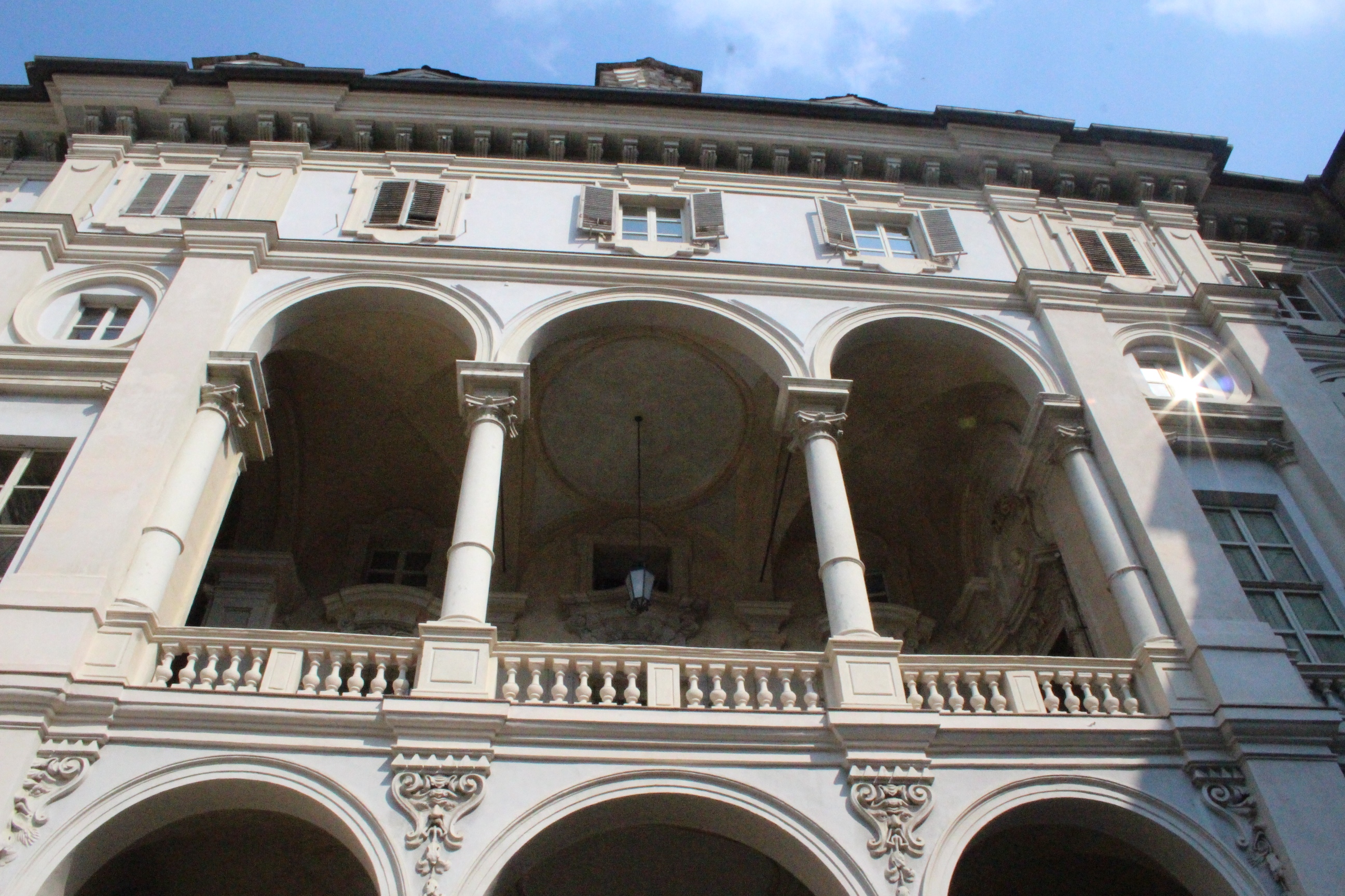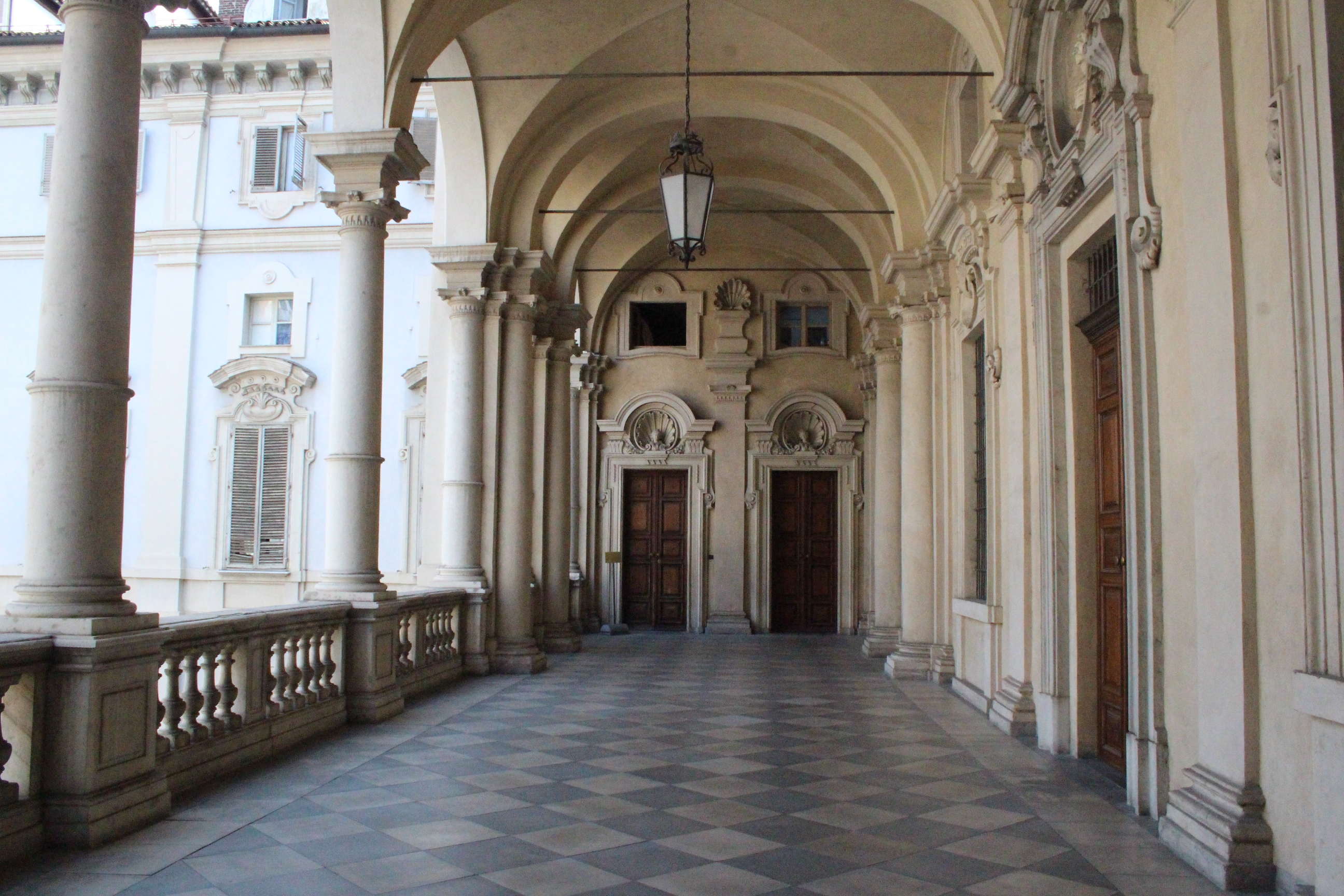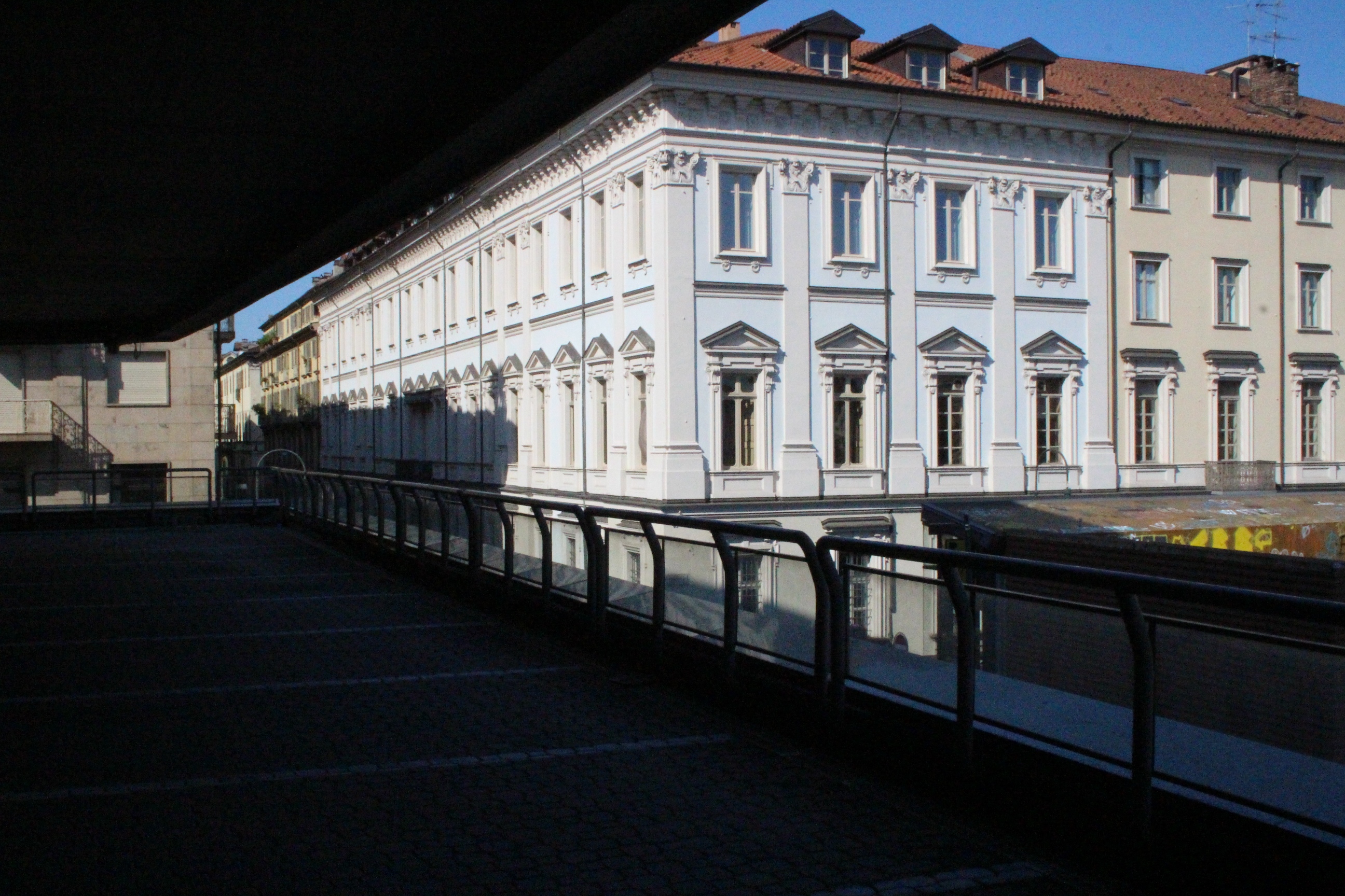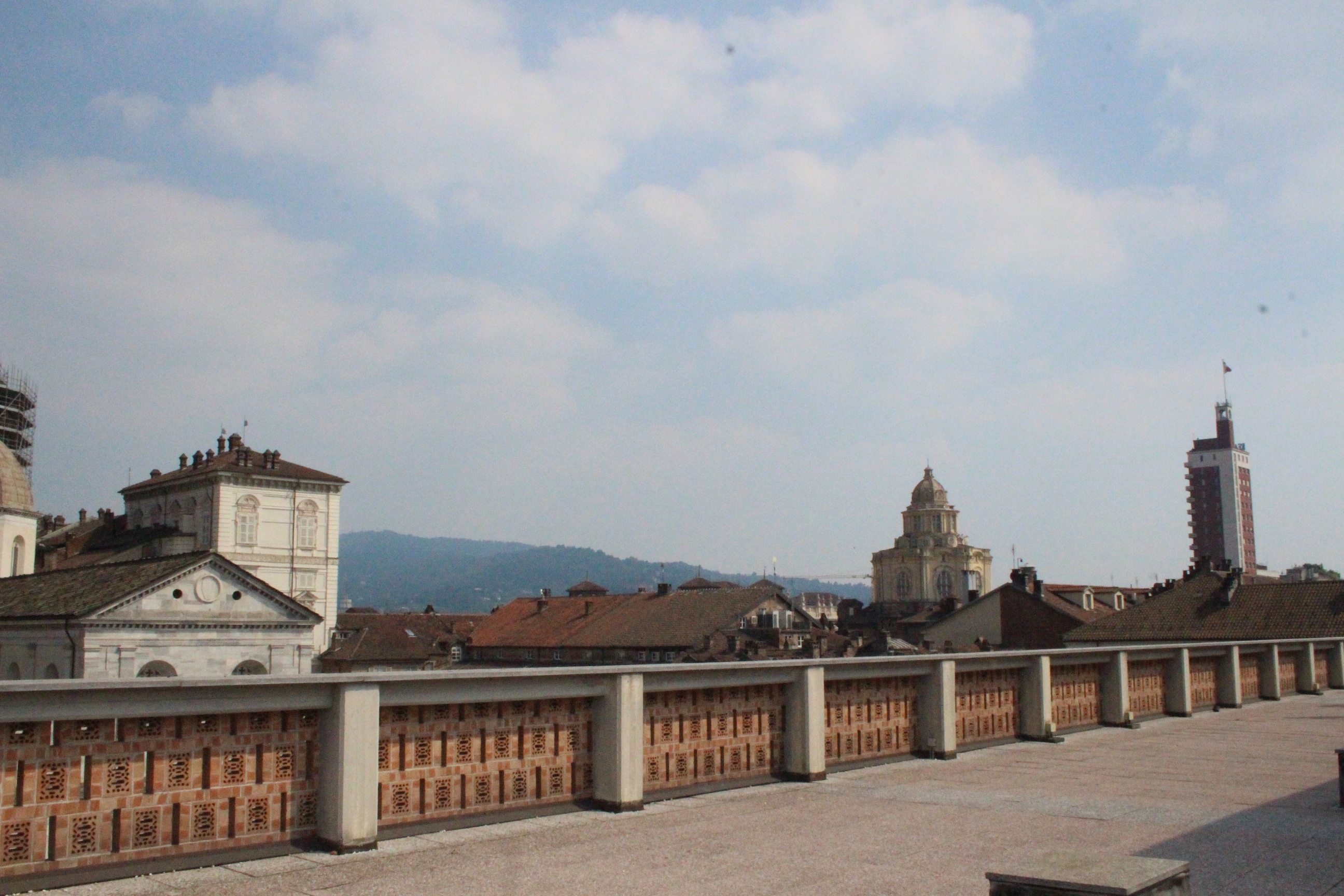 Tra le altre cose davanti a cui si passa spesso senza nemmeno pensare possano essere dei luoghi preziosi, la chiesa di Santa Pelagia, in via san Massimo, per lo più sempre chiusa, adibita per poche ore a settimana al culto ortodosso-moldavo e sede di concerti. È una piccola bomboniera barocca, e possiede un coro che non si sviluppa dietro l’abisde, ma di lato, in forma ovale e reso ancora più suggestivo dalla presenza di una decorazione geometrica con fili sospesi e di due pianoforti. Altra meraviglia è Palazzo Saluzzo Paesana, di cui mi è stato possibile visitare solo il cortile e il primo piano del loggiato: il loft esclusivo aperto dall’architetto che ne è proprietario era preso d’assalto. Non mi sono sentita delusa: il palazzo non è stato da meno, pare fosse secondo solo a Palazzo Reale per sontuosità. Con un passaggio dal bello e antico al brutto e moderno, sono passata anche dal Palazzo dei Lavori Pubblici, di cui anche Culicchia parla male nel suo “Torino è casa mia”. Progetto moderno, affacciato su una piazza che, tra Porte Palatine di età romana, Duomo rinascimentale, Palazzo Reale e Palazzo Chiablese che rispecchiano dell’età dei Savoia, ha monumenti che raccontano duemila anni di storia, ci sta che questa specie di casermone rosso-mattone risulti un po’ un pugno nell’occhio. Ma provate a salire sulla terrazza… Superga, la Mole, piazza Castello, le Porte Palatine, e ancora il Quadrilatero, la casa-torre più antica della città, i tetti, comignoli e cupole tra cui quella barocca di San Lorenzo, e la città che si allarga, spazia, si racconta attraverso le sue vie e i suoi monumenti.