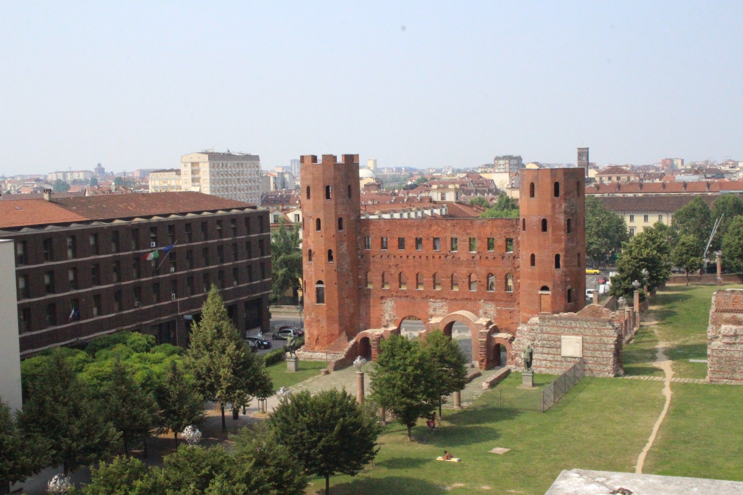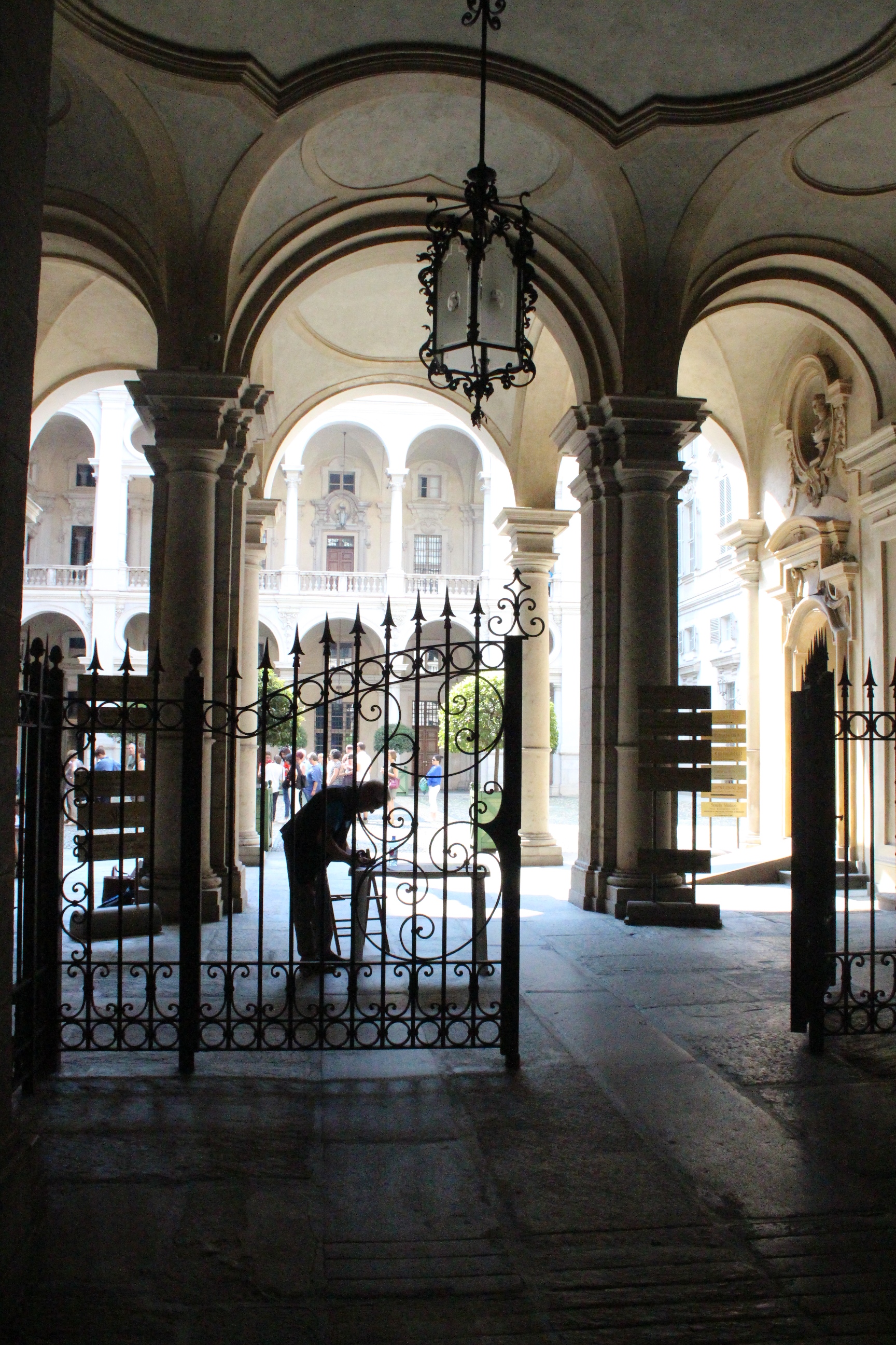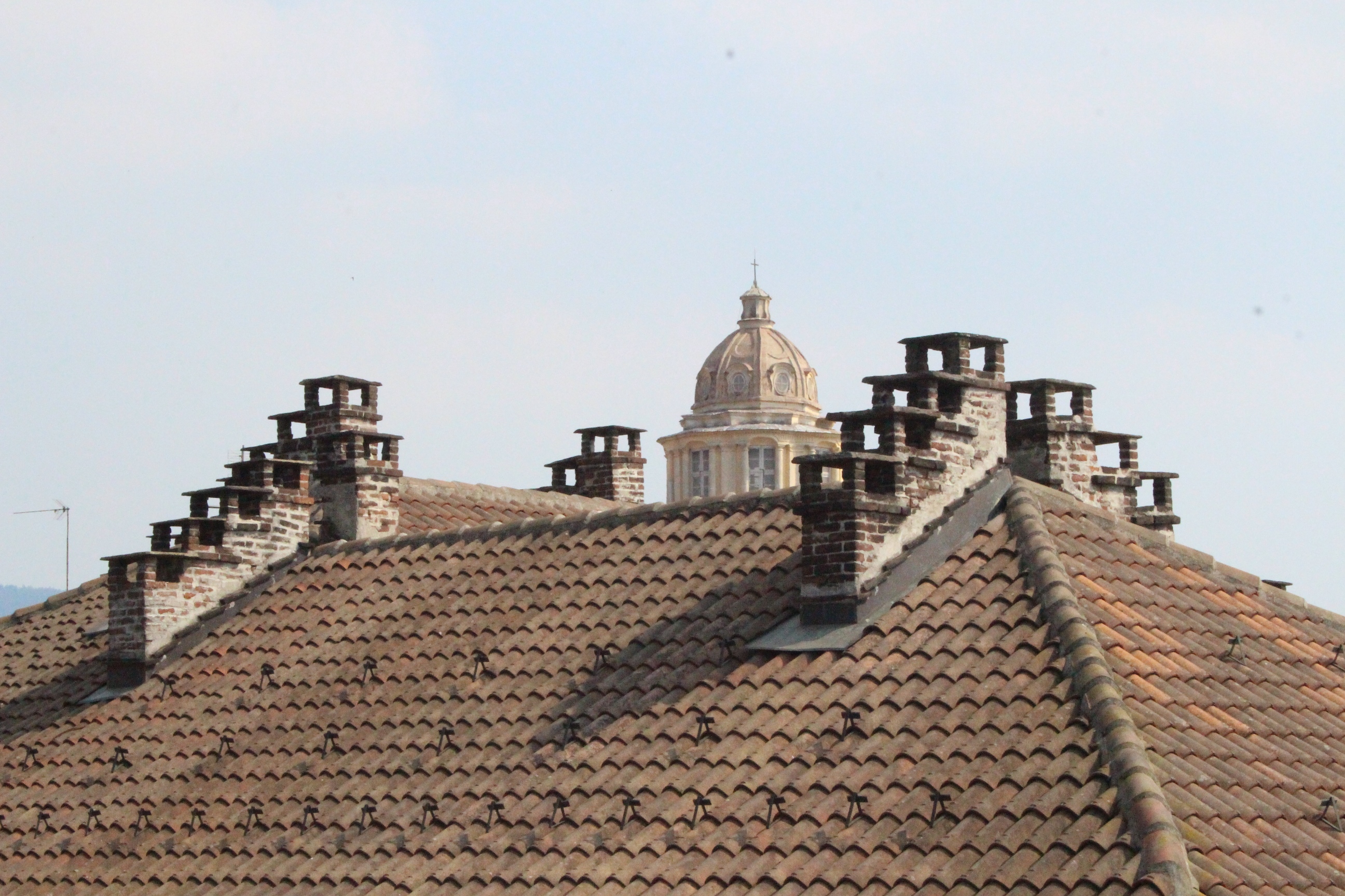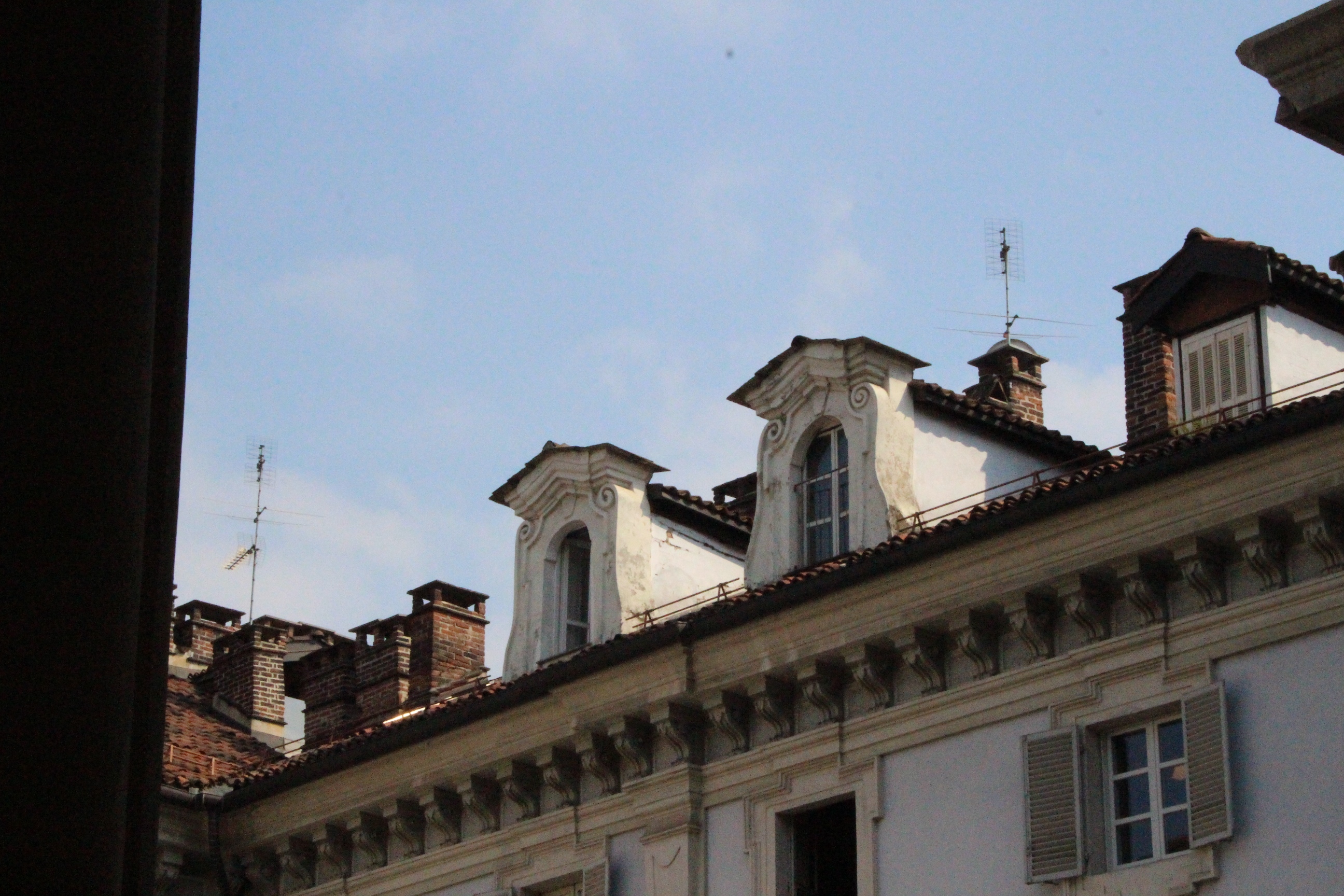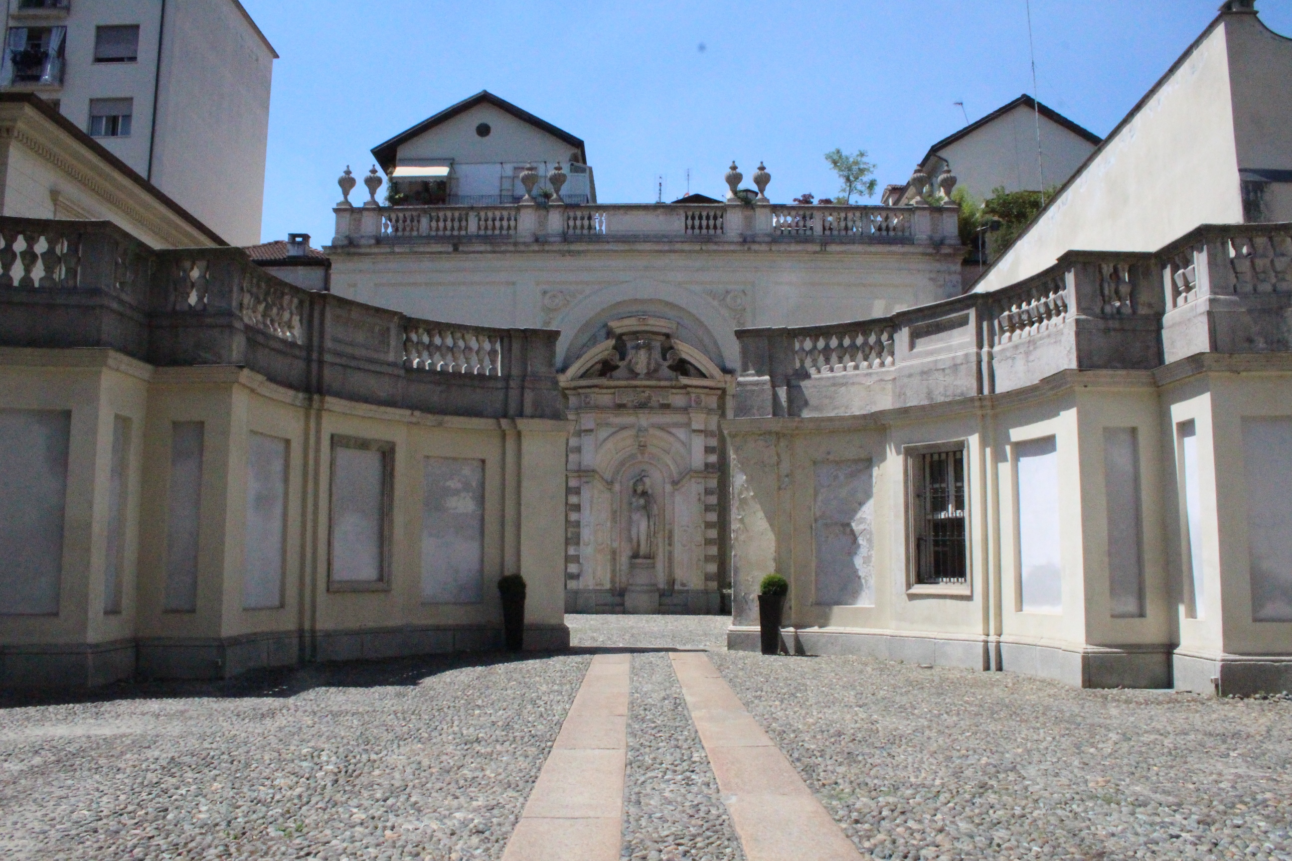 Tra le altre cose davanti a cui si passa spesso senza nemmeno pensare possano essere dei luoghi preziosi, la chiesa di Santa Pelagia, in via san Massimo, per lo più sempre chiusa, adibita per poche ore a settimana al culto ortodosso-moldavo e sede di concerti. È una piccola bomboniera barocca, e possiede un coro che non si sviluppa dietro l’abisde, ma di lato, in forma ovale e reso ancora più suggestivo dalla presenza di una decorazione geometrica con fili sospesi e di due pianoforti. Altra meraviglia è Palazzo Saluzzo Paesana, di cui mi è stato possibile visitare solo il cortile e il primo piano del loggiato: il loft esclusivo aperto dall’architetto che ne è proprietario era preso d’assalto. Non mi sono sentita delusa: il palazzo non è stato da meno, pare fosse secondo solo a Palazzo Reale per sontuosità. Con un passaggio dal bello e antico al brutto e moderno, sono passata anche dal Palazzo dei Lavori Pubblici, di cui anche Culicchia parla male nel suo “Torino è casa mia”. Progetto moderno, affacciato su una piazza che, tra Porte Palatine di età romana, Duomo rinascimentale, Palazzo Reale e Palazzo Chiablese che rispecchiano dell’età dei Savoia, ha monumenti che raccontano duemila anni di storia, ci sta che questa specie di casermone rosso-mattone risulti un po’ un pugno nell’occhio. Ma provate a salire sulla terrazza… Superga, la Mole, piazza Castello, le Porte Palatine, e ancora il Quadrilatero, la casa-torre più antica della città, i tetti, comignoli e cupole tra cui quella barocca di San Lorenzo, e la città che si allarga, spazia, si racconta attraverso le sue vie e i suoi monumenti.