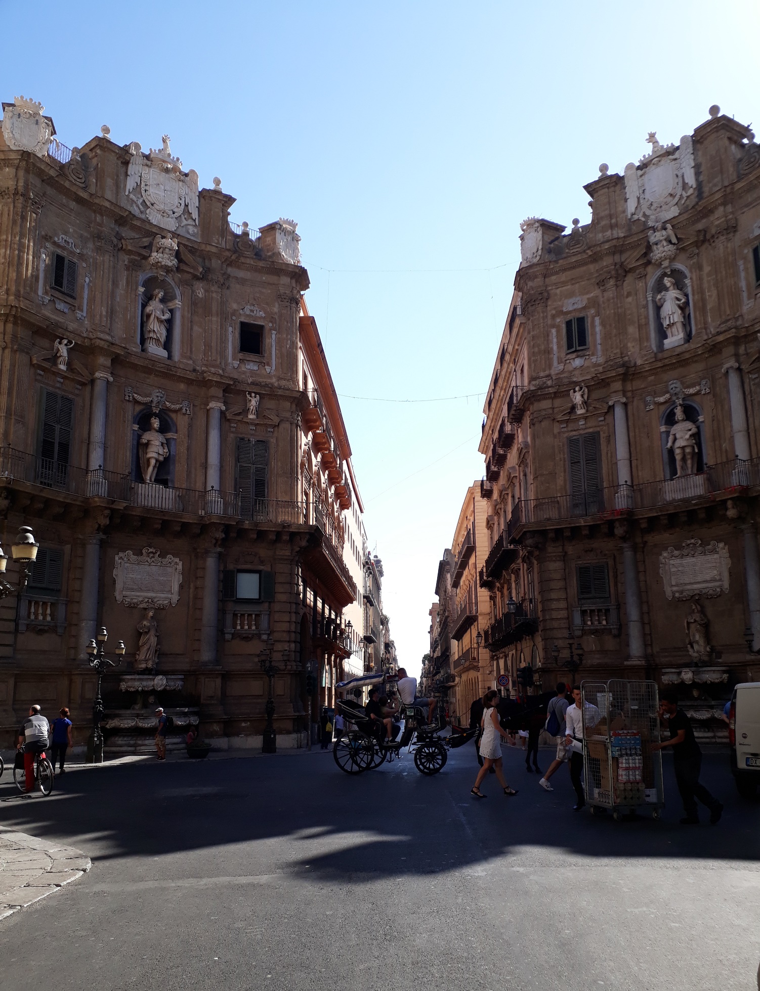 Sapevo – un assaggio ce lo aveva dato il tramonto all’arrivo – che la luce in Sicilia è diversa. Che il sole picchia sulla pietra creando un’atmosfera dorata, calda di un’intensità che contrasta con un cielo di un azzurro pulitissimo e nitido. Quei colori, quella tonalità e quella saturazione li ho ritrovati passeggiando in torride giornate di fine luglio per la città. La pietra riluce, inutile far finta di no: sulla cattedrale, tra le statue di Piazza Pretoria, sul Palazzo dei Normanni, sulle facciate delle case, coi loro terrazzini e le ringhiere in ferro battuto che raccontano di un’isola, del barocco, dei popoli e delle culture che si sono stratificate lì, e di un intero mondo che scalda cuore e pensieri. Stava iniziando il mio Mal di Sicilia e ancora non lo sapevo, ma lo intuivo scattando foto affascinata, ben consapevole che il segreto di quella luce sarebbe rimasto là, rifiutato per troppa bellezza dall’obiettivo di qualsiasi macchina fotografica. Abbiamo pianificato poco: uno sguardo alla mappa di tanto in tanto, molti giri casuali, ma spesso fortuiti, arrivando a scoprire piazze e palazzi importanti. Il tempo era poco e il caldo intenso, e poi già sapevamo che a Palermo saremmo tornate: impossibile starne troppo a lungo senza. Così sono arrivate piazze inondate di sole, dove il barocco esplodeva tra foglie di banano e Vespe posteggiate nel cono di ombra, facciate di chiese dorate, bicilette appese ai muri, chiese inaspettate dalle cupole arabe rosse, campanili in pietra, cavalieri di Malta, giardini segreti di melograni e fichi d’india.