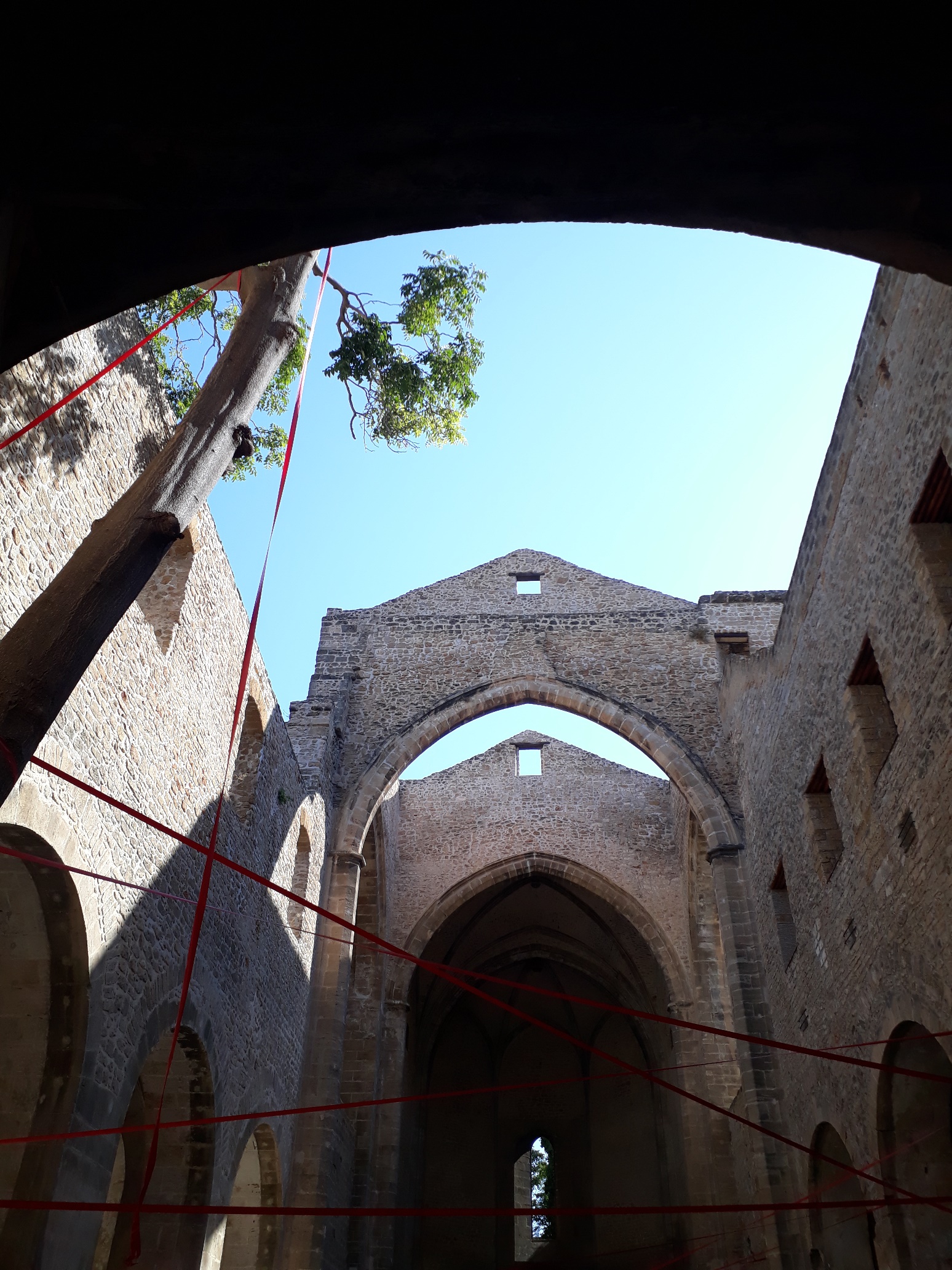 Non c’è stato nulla da fare: la chiesa dello Spasimo si è fatta attendere fino alle ultime ore dell’ultimo giorno. E poi finalmente, eccola: un edificio non crollato ma, invece, mai finito. Arcate gotiche e altissime pareti che si chiudono aprendosi sull’azzurro del cielo, chiome d’albero dentro la navata, una selva di fili rossi a decorare quello che oggi è il palcoscenico per tanti spettacoli e iniziative culturali. Dopo cinque giorni  a inseguire scene, colori e immagini che avevo solo letto e immaginato leggendo “Ciò che inferno non è”, segnandomi brani e rileggendoli a spasso per la città, finalmente lo spasimo, quel luogo preciso, vero, di pietra, cielo e infinito amore per una città.