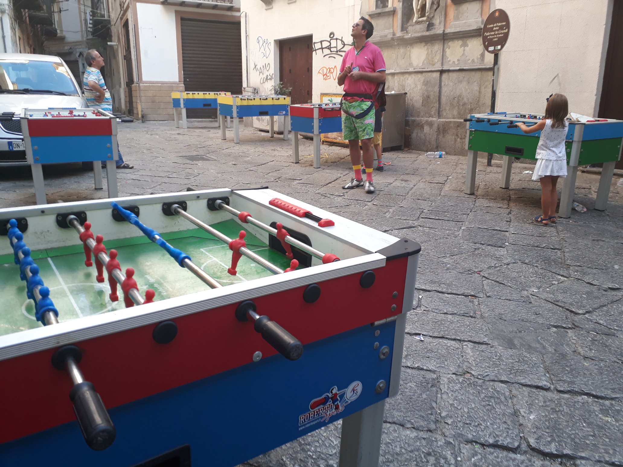 Siamo a Palermo da nemmeno due ore, non abbiamo ancora avuto tempo di studiare la cartina né abbiamo immaginato un itinerario per domani e i prossimi giorni. In piena serenità siamo andate a cena e ci siamo avviate per una passeggiata pre-sonno in cui scoprire qualche angolo della città. Non so se l’idea fosse di incamminarci verso il porto seguendo l’attrazione del mare, o di scoprire viuzze centrali, davvero non ricordo i momenti prima della decisione di deviare rispetto al rettilineo di Via Vittorio dubitando “boh, se ci infiliamo per i vicoli poi ci perdiamo” e rispondendo all’ipotesi con una significativa virata a sinistra al suono di “e allora perdiamoci”. Fatto sta che a pochi metri dal corso centrale ci siamo ritrovate come risucchiate dentro uno stargate che ci ha proiettate in una dimensione parallela: eravamo nella Vucciria, uno dei tre mercati cittadini che, ci avevano detto, ora è in decadenza. È stato come essere catapultati nel cuore pulsante di qualcosa ancora da scoprire, qualcosa che era pronto ad accoglierci anche se non sapevamo né ci eravamo preparate, qualcosa che ha colto la nostra voglia di sud e di Sicilia e ci ha spalancato la porta di casa offrendoci quanto di meglio e di più autentico potesse elaborare. Pesce alla griglia, pentole di sugo sulla via, tornei di calcio balilla, e una festa. Il venerdì sera alla Vucciria c’è lo stritfud, i pochi banchi di mercato si trasformano in banchetti da cibo di strada, la musica impazza locale dopo locale, o forse finestra dopo finestra, a volumi pazzeschi, in mezzo ai vicoli che chiudono la Vucciria e la accompagnano verso piazza Marina e il porto. Proiettate in questa sorta di festa mobile, del tutto casuale, mentre cercavamo di capire e assaporare i profumi di cose buone cotte al momento per strada e cogliere il tono della festa, ci siamo ritrovate in un vicolo pieno pieno di persone, impossibile passare. Impazzava a un volume altissimo “Azzurro” di Paolo Conte, cantata da Celentano, e tutti ballavano. Ecco, è stato in quel momento che siamo davvero arrivate a Palermo. Perché ci siamo messe a cantare “Azzurro”, con le parole che tutti sappiamo a memoria anche senza sapere di conoscerle, e ballando e cantando la folla ci ha attirato, mescolato e fatte passare per superare l’imbuto del vicolo. In mezzo, un motorino a velocità sostenuta, senza casco in mezzo alla folla, un venditore di accendini sistemati per gradazione cromatica, calcetti buttati per la strada, coppie avvinghiate in baci estivi, cani stanchi morti buttati lì agli angoli della via. E un sorriso complice che ci si era allargato sul viso: welcome, benvenute, siamo a Palermo, Italia, estate 2017.