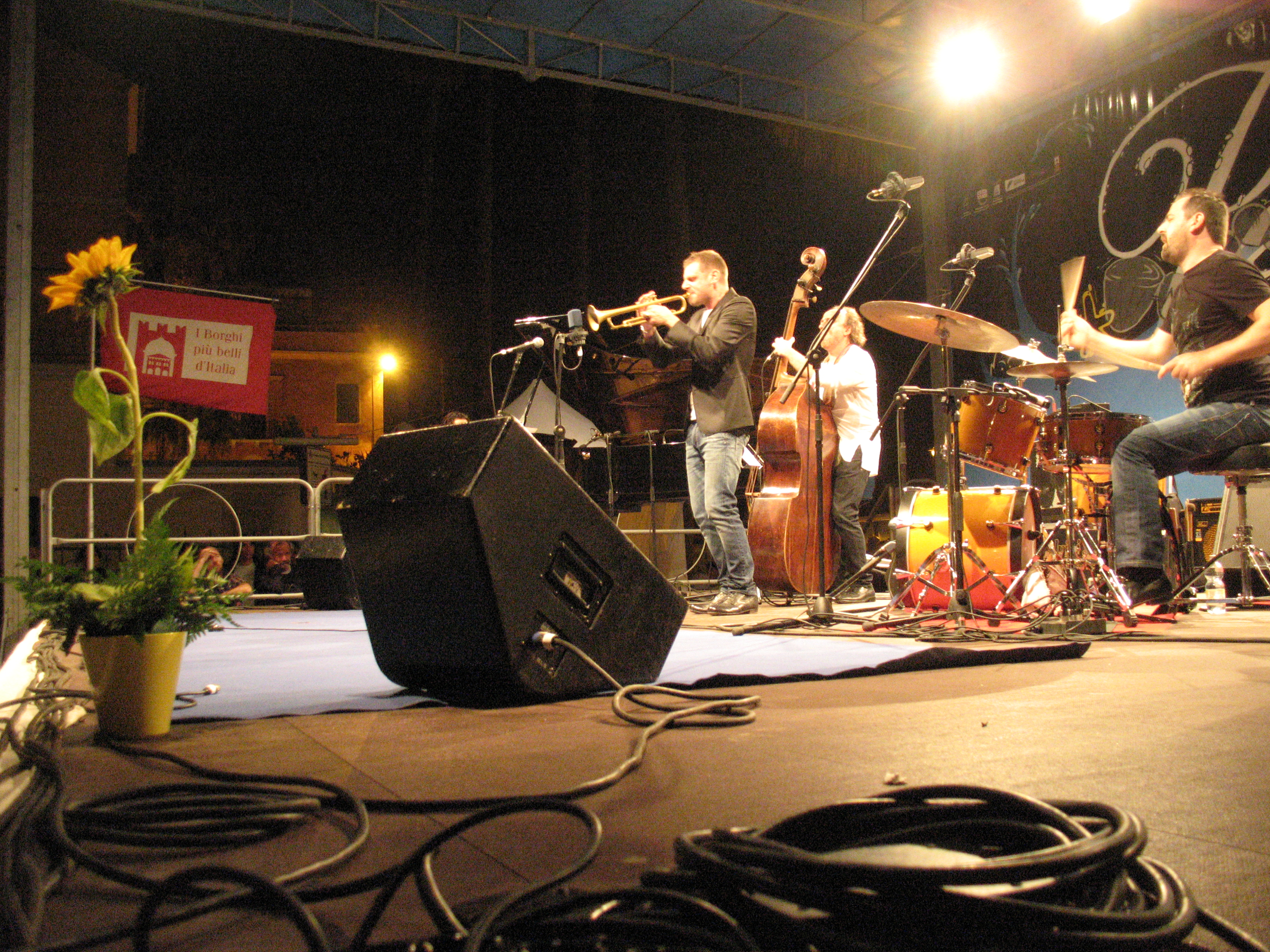 Anche se non vedi tutto come vorresti, sei di lato, la gente ti viene quasi addosso, ti accorgi dei cavi, dei ragazzi che non riescono a regolare bene i suoni dalla consolle, respiri le sigarette che fumano, hai un amplificatore davanti. Però sei lì con loro, li vedi, quasi li tocchi, ti accorgi di quelle segrete occhiate tra musicisti che fanno il Jazz. E tutto il resto scompare: ti emozioni con quei suoni, mentre intuisci il mare, lì, dietro il palco, le palme, la passeggiata. Il mare che si unisce all’armonia con la sua serena risacca. Atmosfera incantata. La luna si riflette sull’acqua increspata, i lampioni arancio riscaldano l’aria: romantici riflessi riempiti di Jazz.