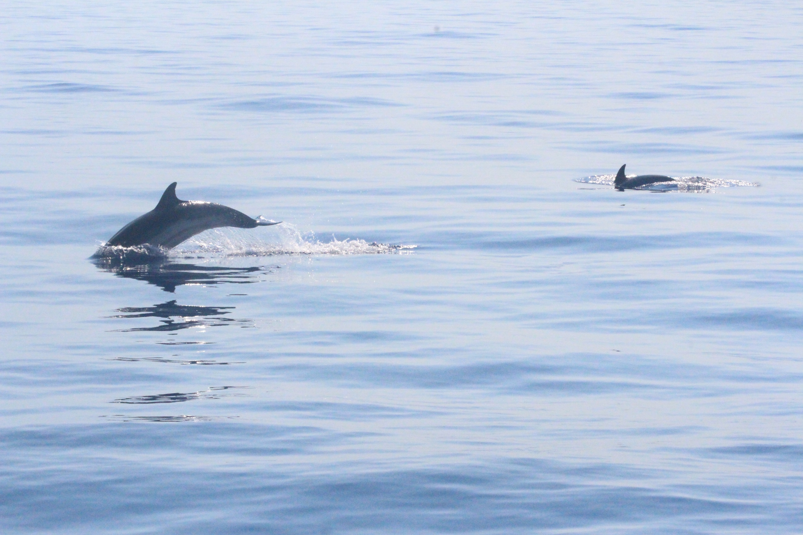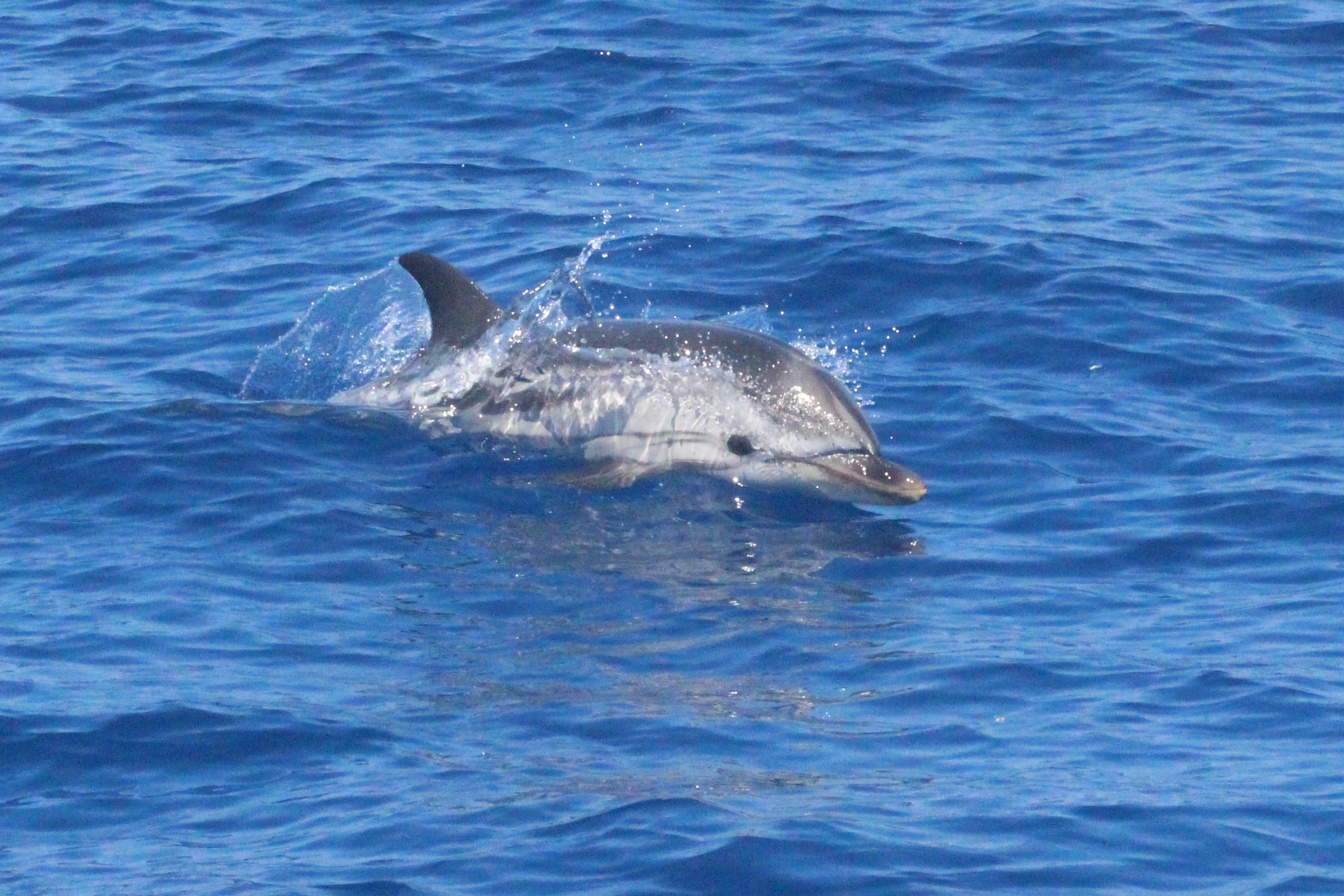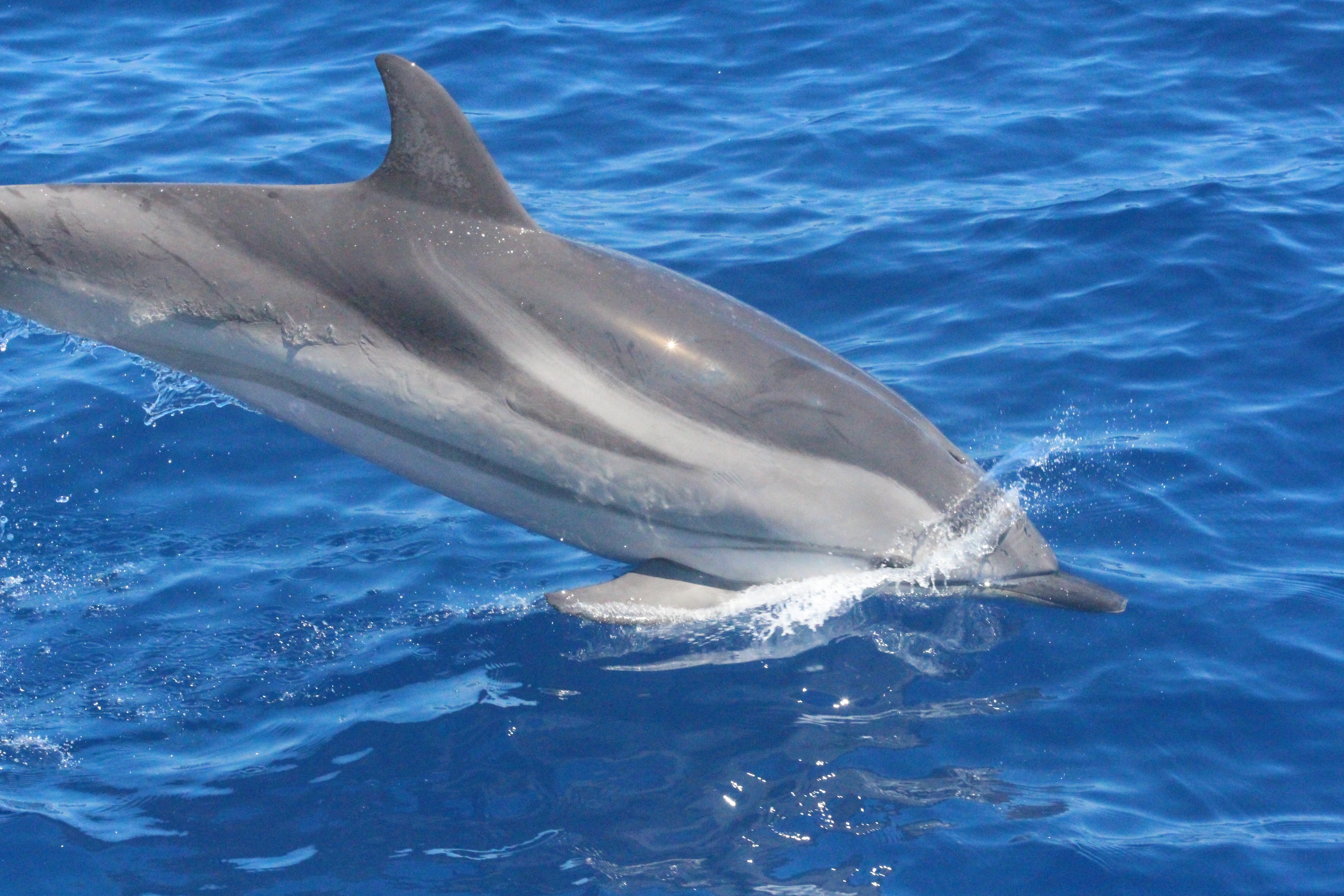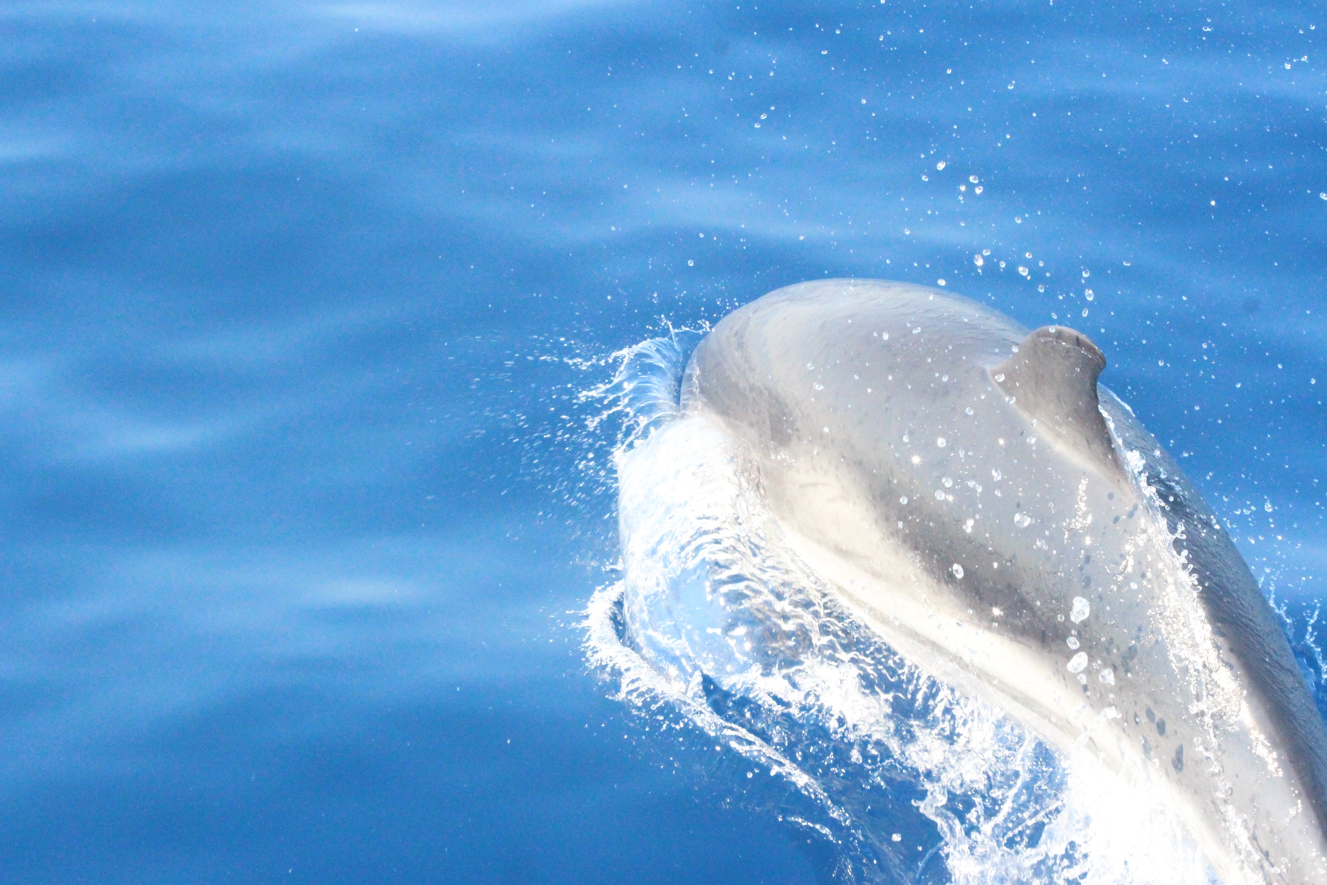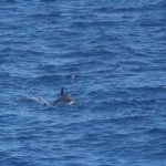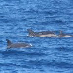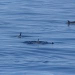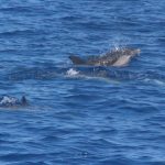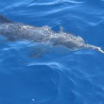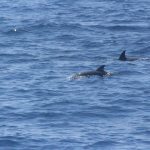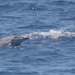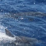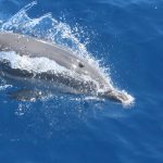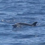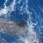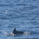 Stenelle, invece, in quantità, e non stancano mai (nota: le stenelle sono delfinidi, così come delfini, tursiopi, globicefali, grompi, e sono quelle che vedete nelle foto). Sono animali bellissimi: appaiono, le pinne fuori dall’acqua, in branco. Affiancano la barca, le corrono a fianco, giocano, fanno a gara con la scia di schiuma, testa a testa con la prua che taglia l’acqua. Sembra che sorridano, hanno un muso dolcissimo, sul dorso lo sfiatatoio con cui respirare, i fianchi striati, da cui il loro nome, stenelle striate. Potete sentirli, i “click” delle stenelle, ci ha esortato Sabina a un certo punto. E così, mentre tutti sgomitavano a prua per scattare la foto perfetta della stenella con la livrea lucida che salta tra le ondine, io sono entrata, raggiungendo Nino. Posso? Certo. Wow, la scienza a portata di cuffia: e chi le ha mai sentite parlare, le stenelle? Sul monitor sono comparsi pallini, a ognuno uno schiocco, e ogni tanto una specie di squittio. È stranissimo, commentavo con Nino, tu sei qui dentro, non vedi nulla, ma dall’addensarsi dei suoni capisci che siamo in mezzo a un branco, oppure se si sta avvicinando qualche stenella isolata.