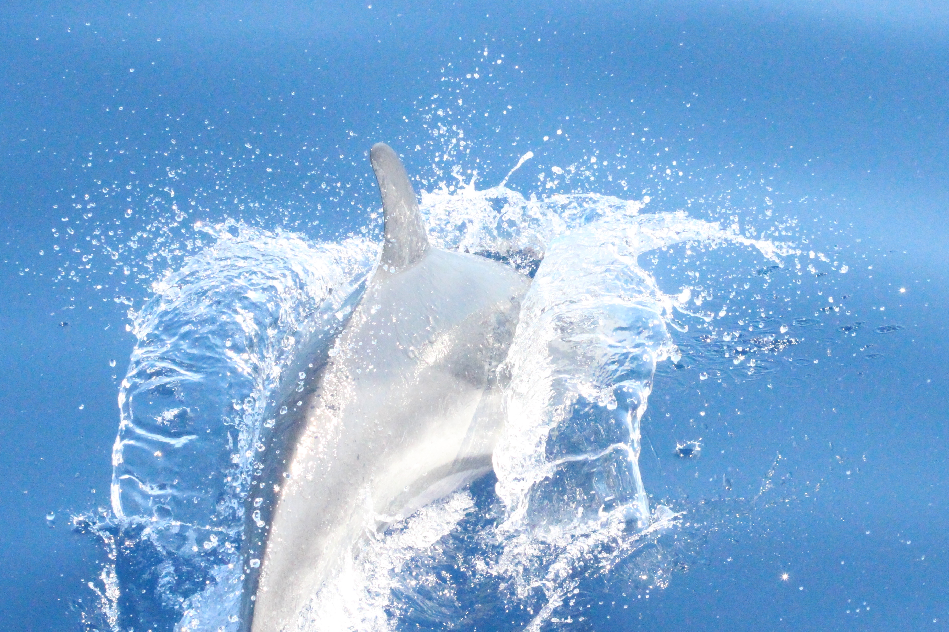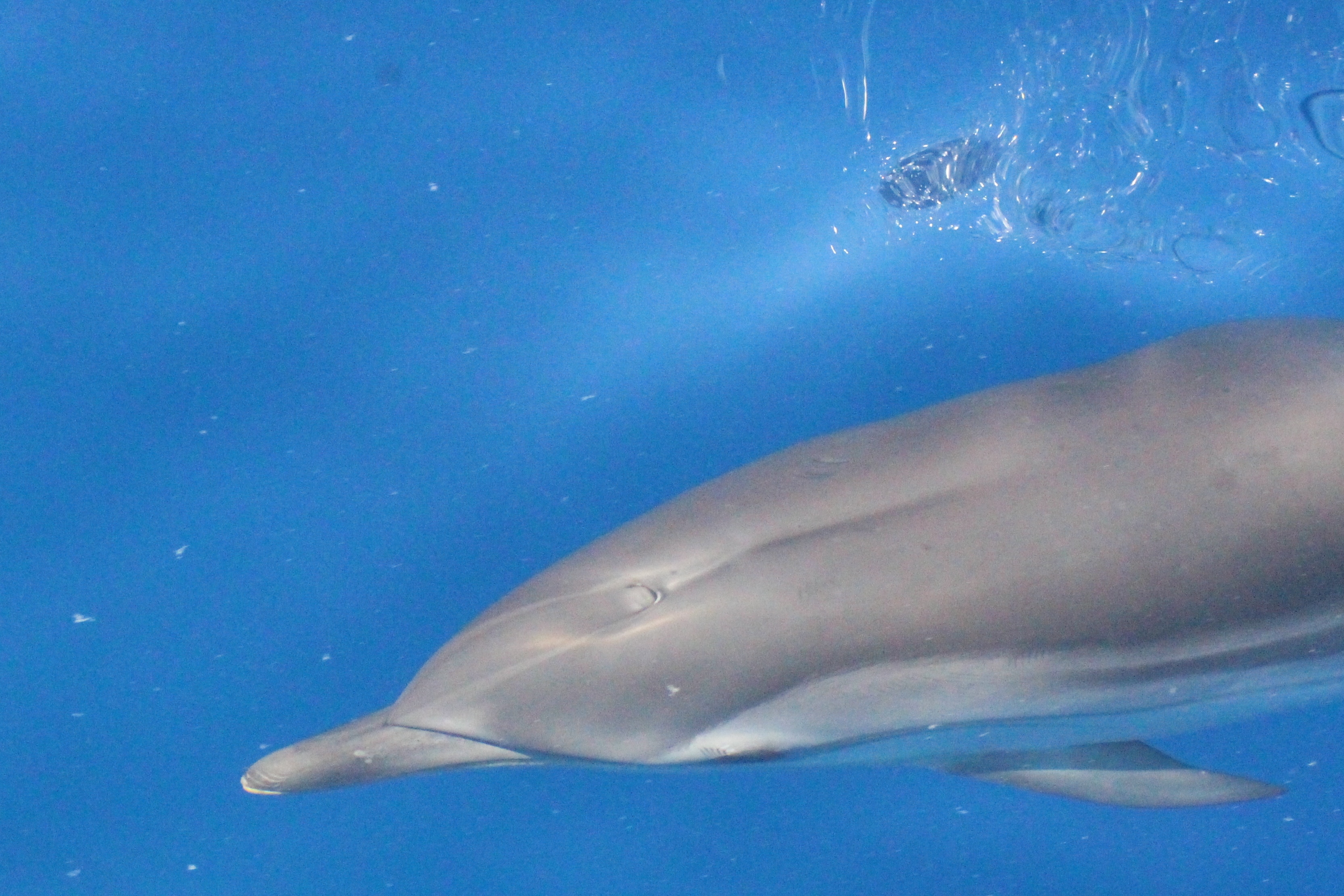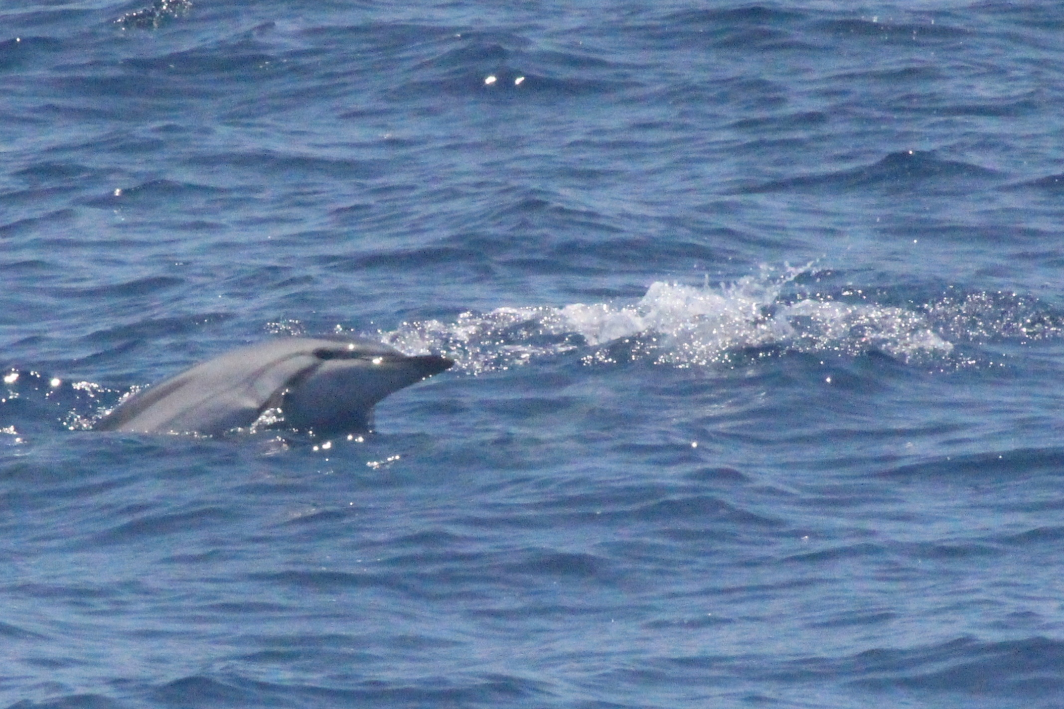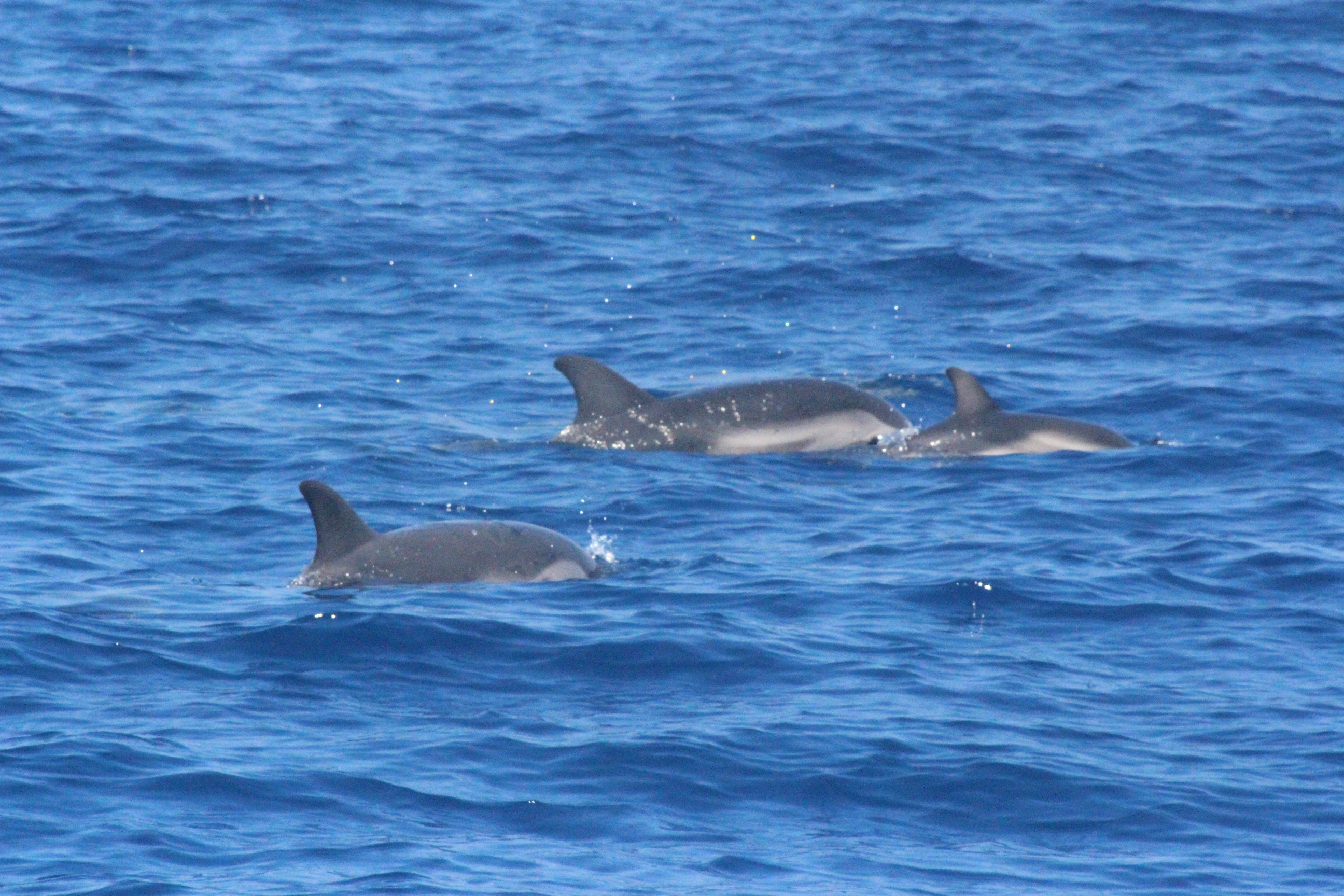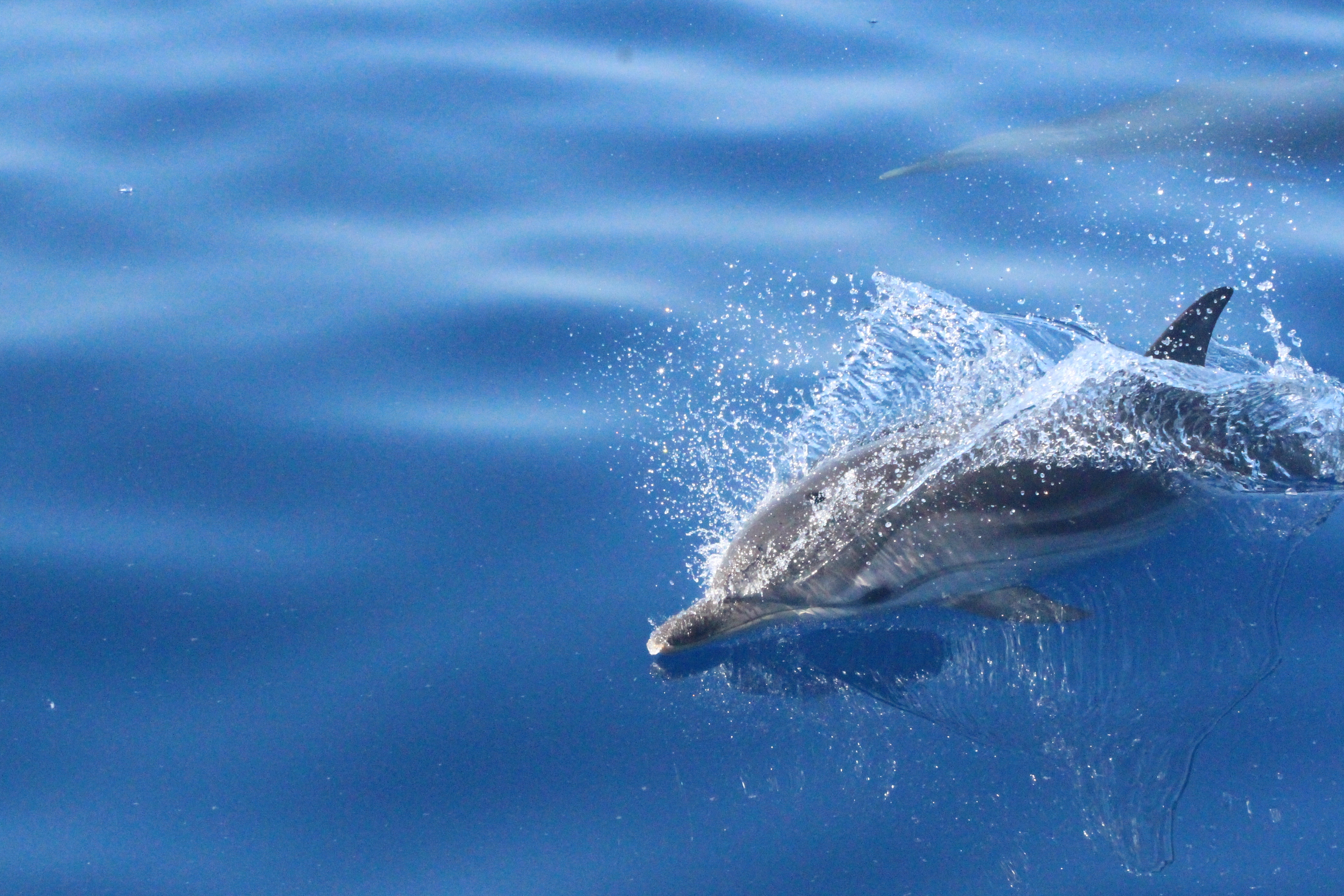 Stenelle, invece, in quantità, e non stancano mai (nota: le stenelle sono delfinidi, così come delfini, tursiopi, globicefali, grompi, e sono quelle che vedete nelle foto). Sono animali bellissimi: appaiono, le pinne fuori dall’acqua, in branco. Affiancano la barca, le corrono a fianco, giocano, fanno a gara con la scia di schiuma, testa a testa con la prua che taglia l’acqua. Sembra che sorridano, hanno un muso dolcissimo, sul dorso lo sfiatatoio con cui respirare, i fianchi striati, da cui il loro nome, stenelle striate. Potete sentirli, i “click” delle stenelle, ci ha esortato Sabina a un certo punto. E così, mentre tutti sgomitavano a prua per scattare la foto perfetta della stenella con la livrea lucida che salta tra le ondine, io sono entrata, raggiungendo Nino. Posso? Certo. Wow, la scienza a portata di cuffia: e chi le ha mai sentite parlare, le stenelle? Sul monitor sono comparsi pallini, a ognuno uno schiocco, e ogni tanto una specie di squittio. È stranissimo, commentavo con Nino, tu sei qui dentro, non vedi nulla, ma dall’addensarsi dei suoni capisci che siamo in mezzo a un branco, oppure se si sta avvicinando qualche stenella isolata.