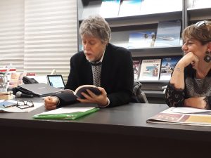 La giornata è qualcosa di poetico, il sole solletica la voglia di primavera e il borgo splende, e così capita anche che io faccia una foto insieme a Luxardo, mentre poi svicolo e vado a tenere il posto all’Oratorio, dove entra Daverio, che al solito tiene due ore di chiacchierata fantastica, e dove riesco a individuare Walter Barberis, presidente di Einaudi, che è invitato a prendere la parola e dice solo “io vorrei che tutti leggessero”. Ecco, sì, gennaio è tanta voglia di cose belle, e scoprire che a un tiro di schioppo da casa tua, in un borgo che è una carezza sul cuore, accadono proprio queste cose, fa bene e inorgoglisce. Non solo per Cervo, perché a gennaio accade un giorno che alla Libreria Mondadori arrivi Fabio Cremonesi, che ha tradotto per NN editore la trilogia di Haruf più Le nostre anime di notte (oltre a lavorare su molte altre cose, naturalmente), e che ho scoperto essere una persona deliziosa, disponibile a raccontarsi e raccontare il proprio lavoro davanti a una ventina di persone, una cifra che per Imperia è sorprendente, e lascia ben sperare.